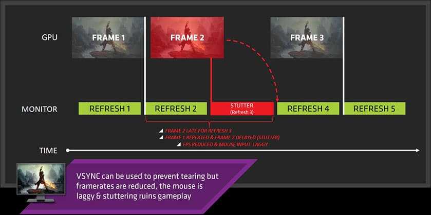 Следовательно, это приводит к дополнительной задержке ввода, и если карта не может отобразить кадры до следующего обновления, она будет отображаться снова, что создает подергивания экрана.