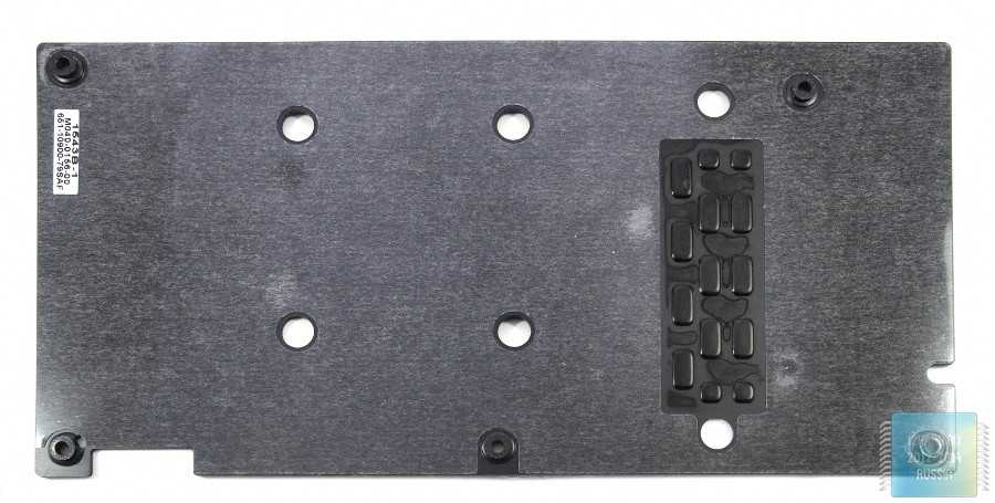 В конце стоит сказать несколько слов о бэкплейте. Вся его поврехность изолирвана для предовтращения от короткого замыкания, но имеется один участок, в котором виднеется рельефный рисунок. Разработчики решили испльзовать пластину еще как и элемент охлаждения, поскольку через черную термопрокладку она отводит тепло с силовой части, что позволяет на практике отыграть несколько градусов с подсистемы питания, что в свою очередь сопровождается более стабильной работой ивысоким разгоном.