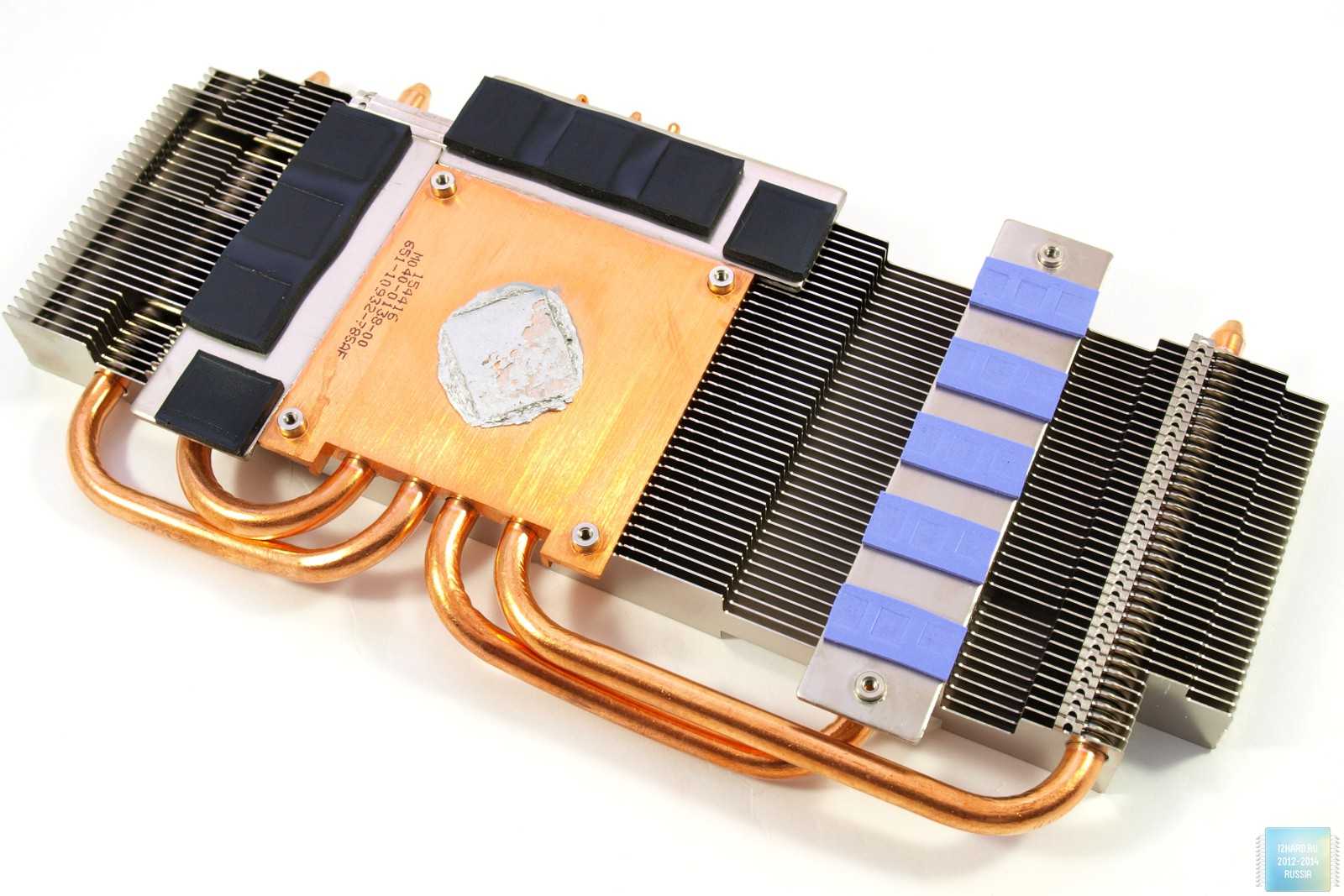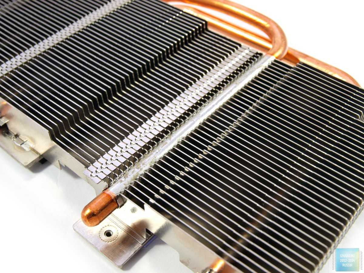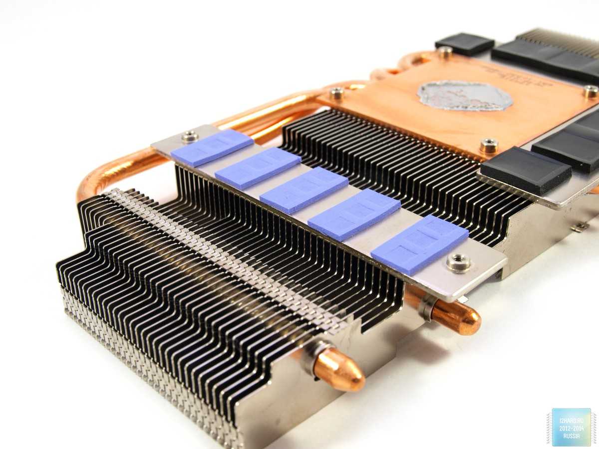 Радиатор массивный, но не слишком габаритный, выполнен из большого количества никелированных пластин и покрывает собой всю длину платы. Он пронизан четырьмя медными теплотрубками для эффективного отвода тепла.