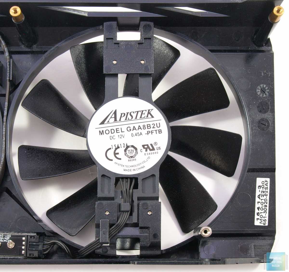 За активное воздушное охлаждение отвечают два крупных вентилятора с диаметром крыльчатки 95 мм. Они представлены компанией Apistek, модель GAA8B2U, скорость вращения составляет 0 – 3000 об/мин.