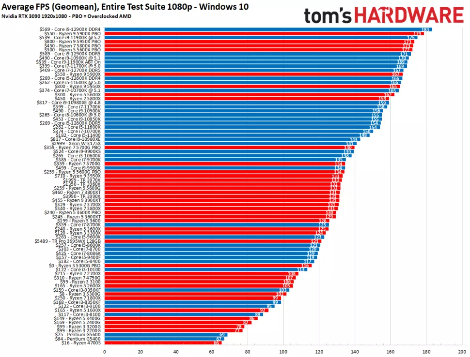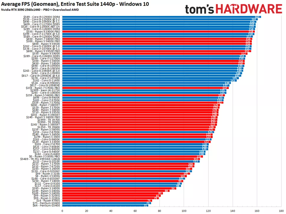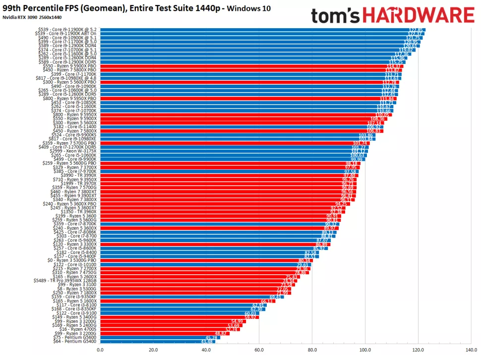 Ниже приведены две серии результатов тестов, которые показывают производительность как в Windows 10, так и в Windows 11, поскольку Intel Alder Lake обеспечивает более высокую производительность в Windows 10, чем 11. Несмотря на это, команда Blue занимает лидирующие позиции в обеих операционных системах. Вы можете увидеть гораздо более целостное представление в нашей иерархии тестов процессора.