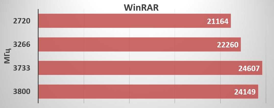 Архиватор WinRAR хоть и зависим от частоты памяти, но прибавка на частотах выше 3200 МГц уже не столь значительная.