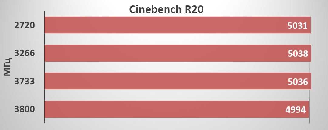 А вот рендеринг изображения в программе Cinebench R20 показывает полную независимость от изменения частоты, и даже наоборот: на частоте 3800 МГц из-за работы шины BCLK на стандартных 100 МГц демонстрируется меньший результат.