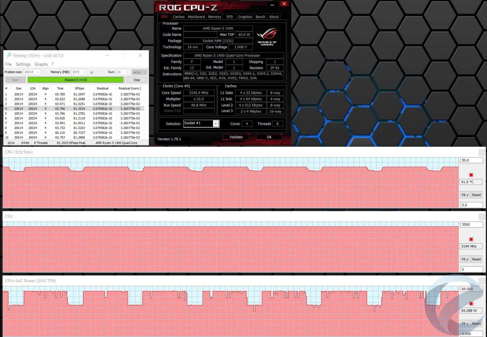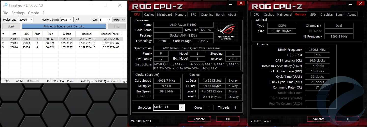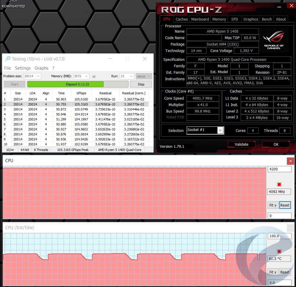 Для тестирования стабильности и нагрева процессора использовалась программа Linx 0.7.0 с объемом задачи 20014.