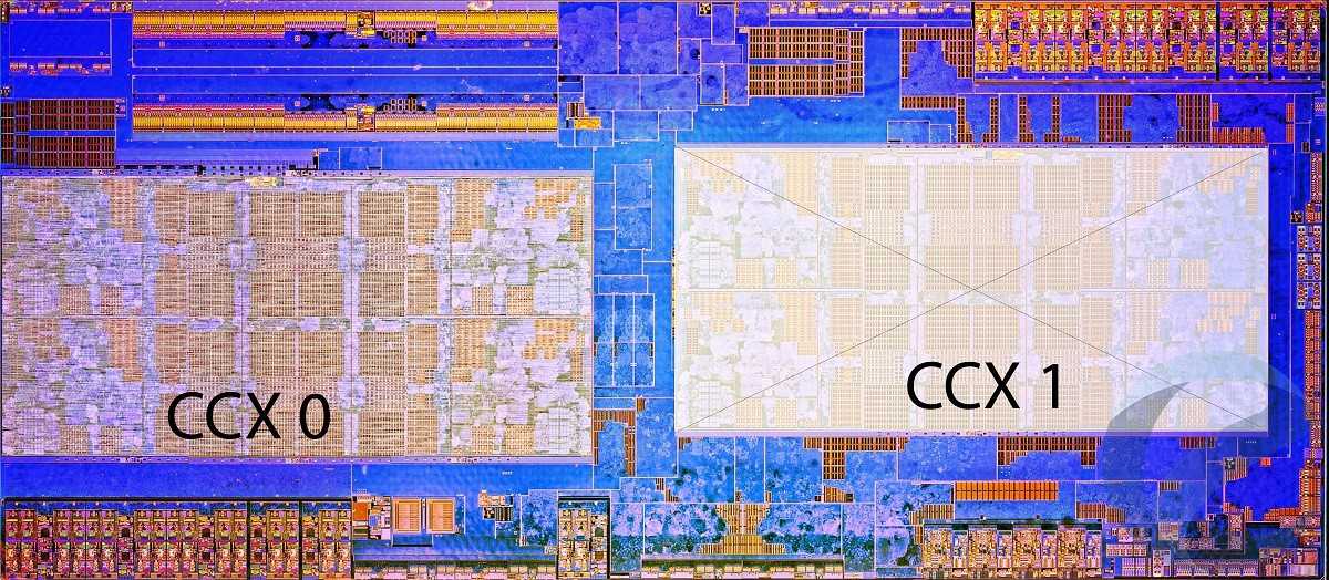 Ryzen 5 1400 сильно отличается от рассматриваемых нами ранее процессоров семействаSummit Ridge. Это четырехъядерный процессорс поддержкой функции SMT, который получается с помощью отключения ядер на кристаллах Ryzen 7. Для Ryzen 5 1400был полностью отключен один модуль CCX, что сказалось на объеме кэш-памяти третьего уровня (уменьшен до 8 МБайт). С другой стороны, для обмена потоками данных между ядрами теперь не будет использоватьсявысокоскоростная шина Infinity Fabric, что должно положительно сказаться на производительности процессора относительно Ryzen 5 1500X, у которого отключено по два ядра в каждом CCX.