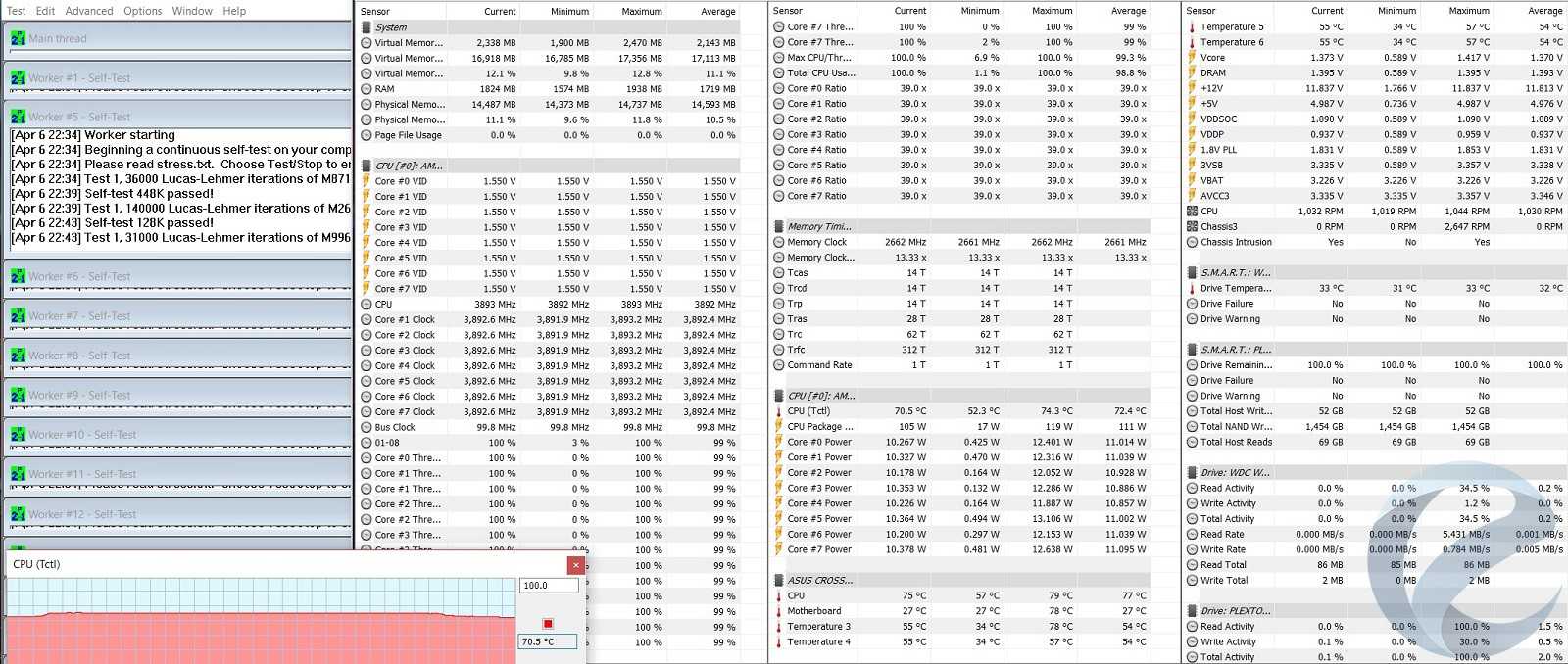 Проверять стабильность в Prime95 на напряжении 1.48 В мы не решились из-за соображений безопасности, используя множитель 39х (3900 МГц) и 1.4 В. В таком режиме процессор без сброса частоты прогрелся до 75оС.
