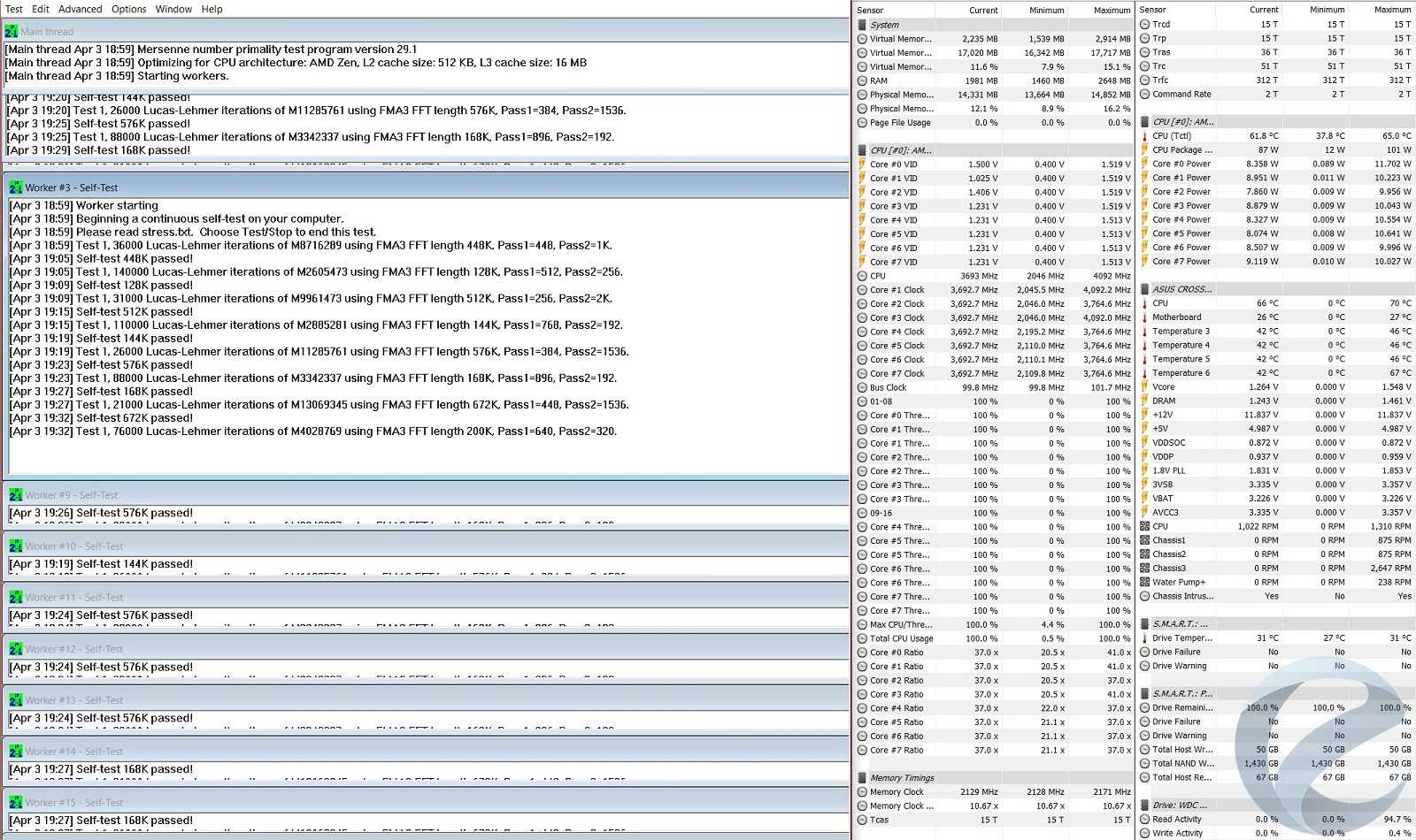 Для тестирования стабильности и температурных режимов использовалась программа Prime95. За 35 минут стресс-теста частота всех ядер не опускалась ниже 3700 МГц, а температура ядер не превысила 65оС. Программа HWInfo зафиксировала максимальное потребление процессора в 101 Вт, среднее составляло 90 Вт. Отличный результат.