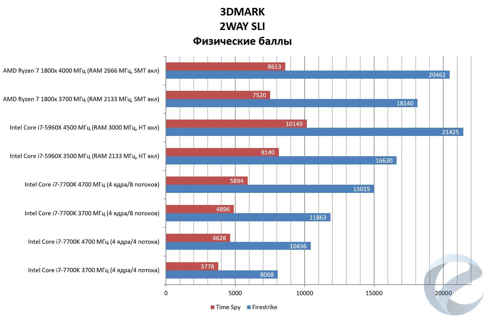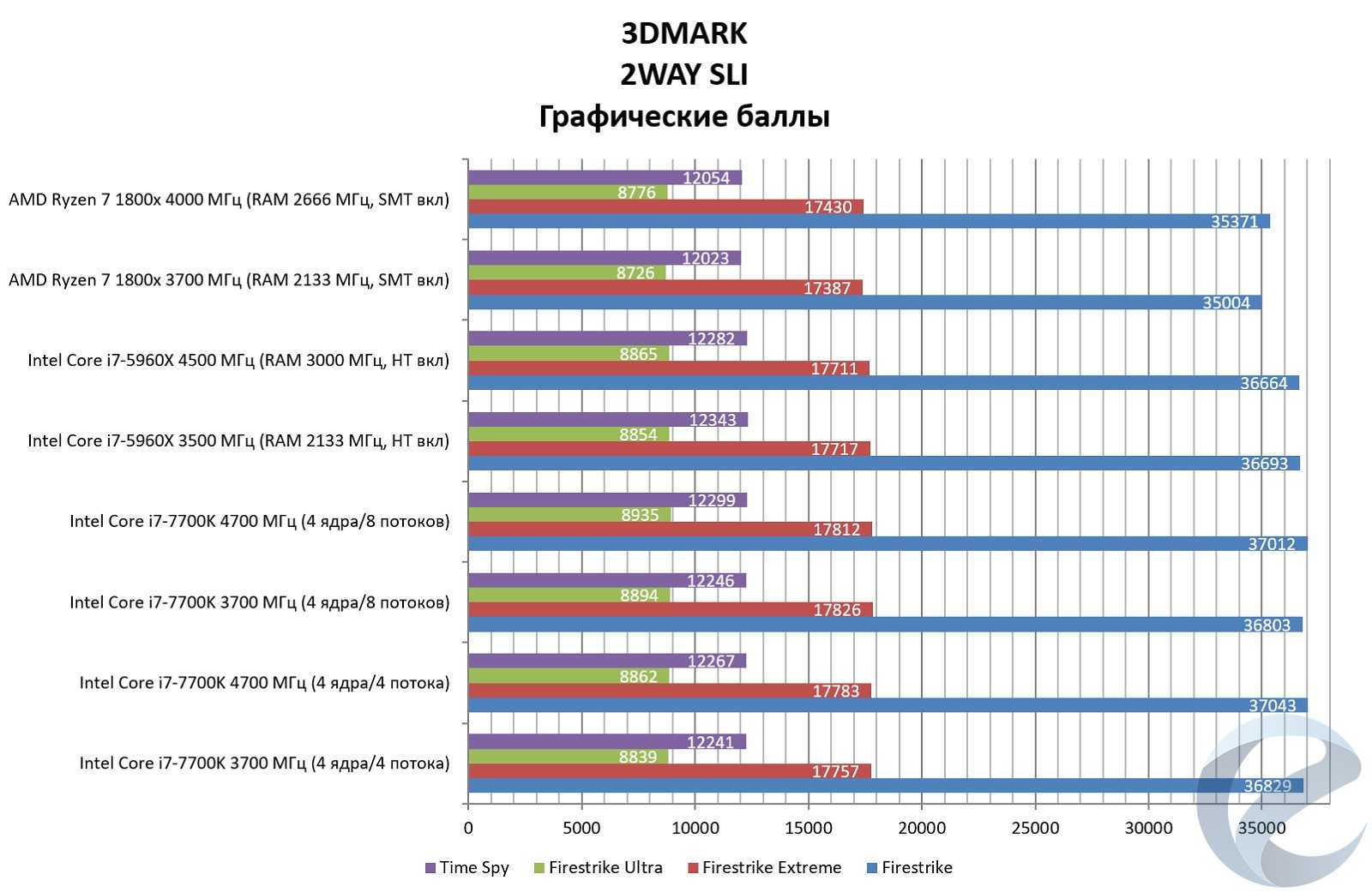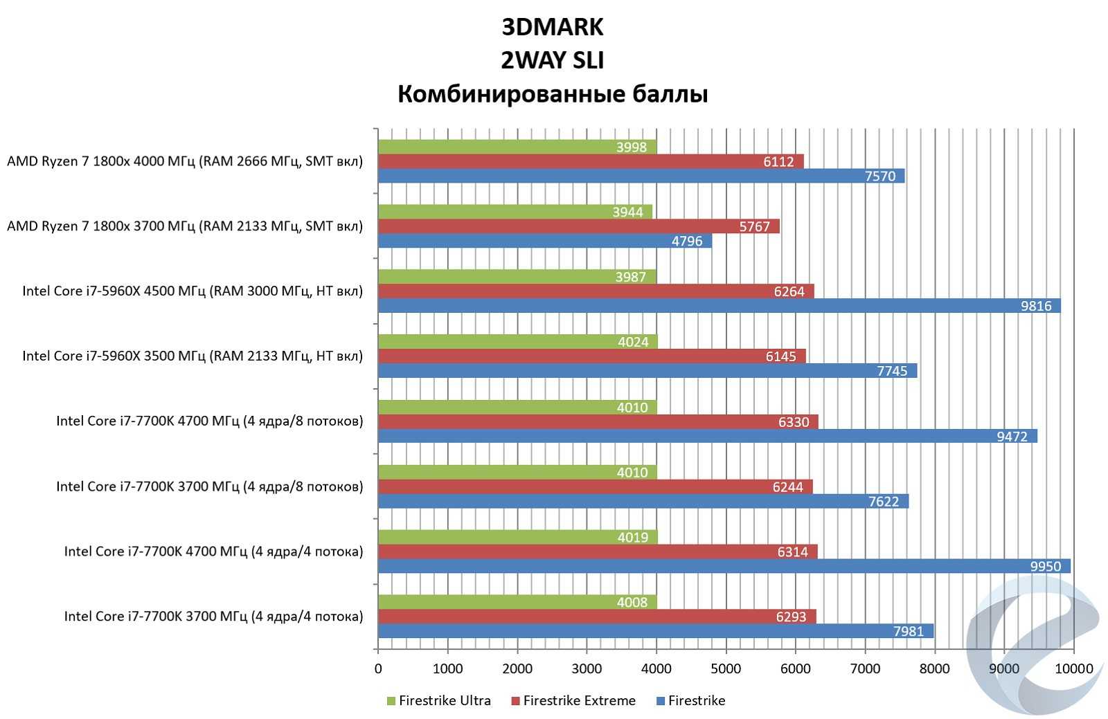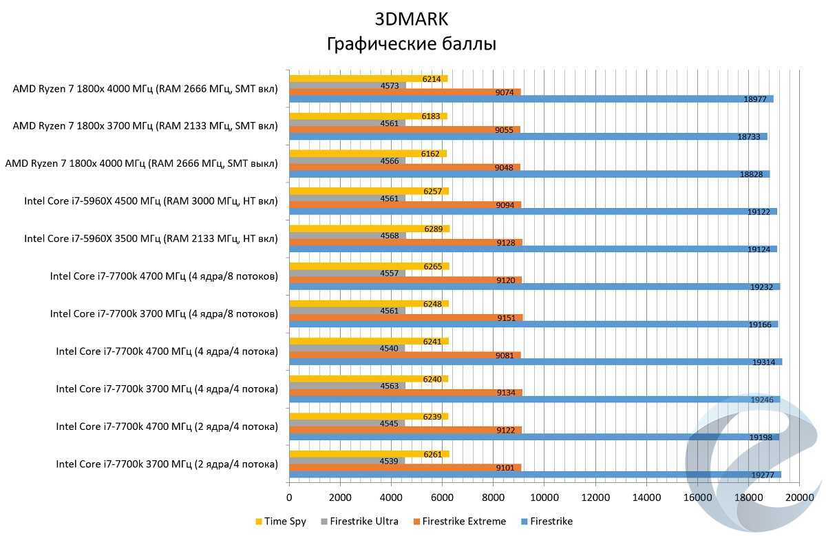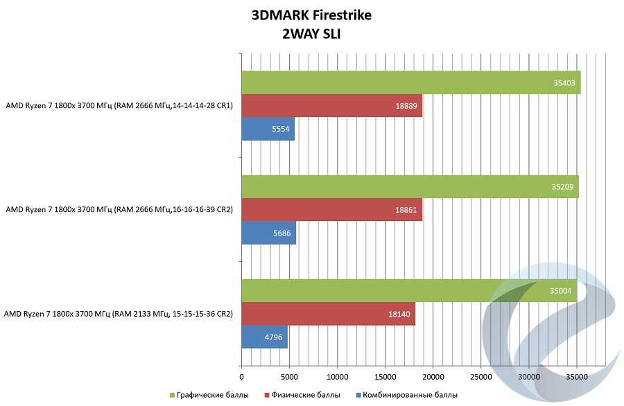 Ryzen R7 1800x в синтетических тестах находится на высоком уровне, что в нагрузке на одно ядро, что вмногопоточности. При условии, что i7-5960x работал на более высоких частотах ядер и оперативной памяти, «чистая» производительность процессора поражает. Возникает вопрос о падении производительности в WinRAR и комбинированных и графических тестах Firestrike с двумя установленными видеокартами. Первое приложение, судя по всему, оптимизировано для процессоров Intel, и в будущем мы сможем увидеть исправления программного кода. В Firestrike была проведена зависимость показателей графических баллов от частоты и таймингов оперативной памяти: