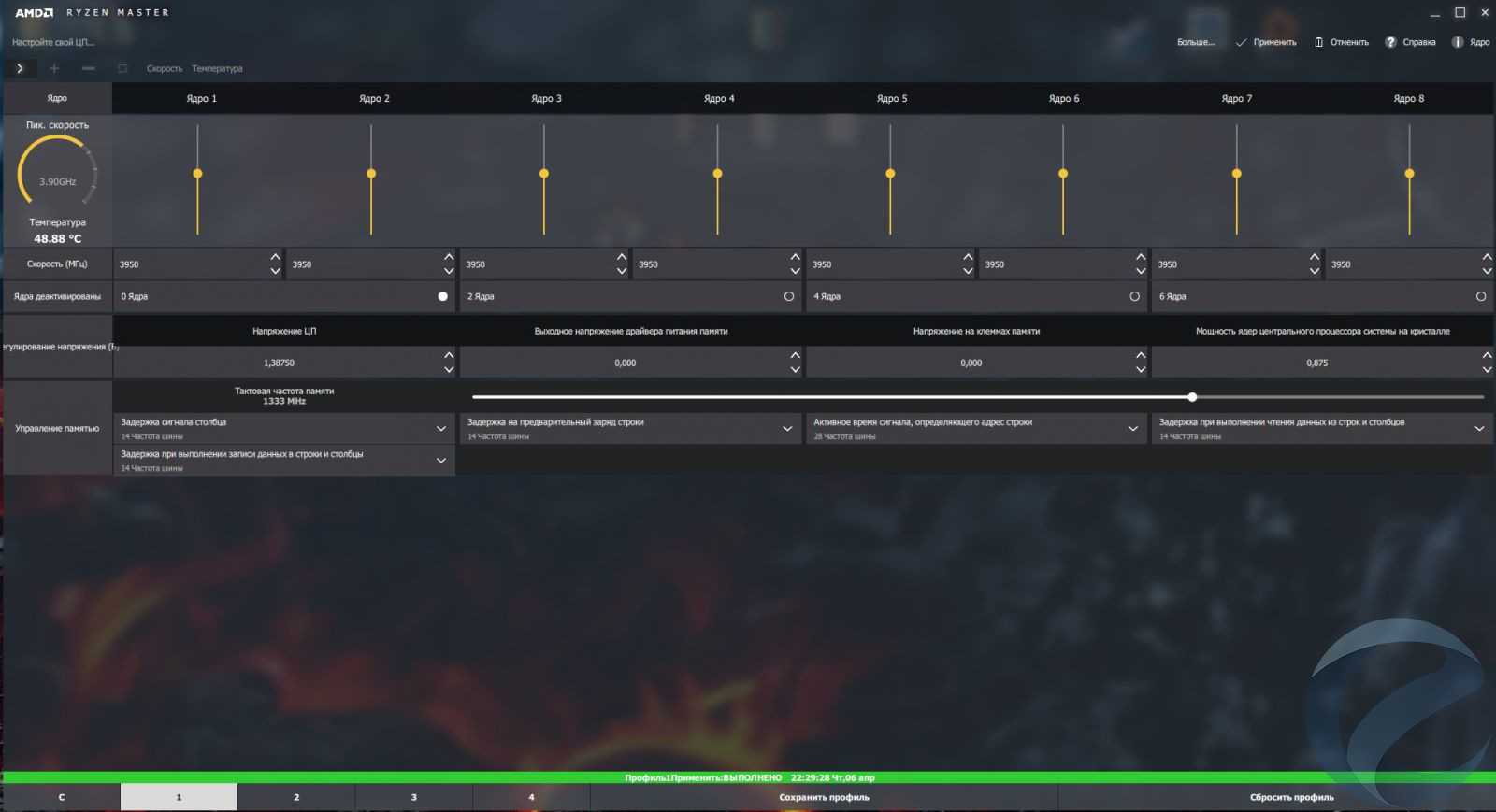 - установка частоты работы памяти (активация DOCP профиля), сохранение настроек