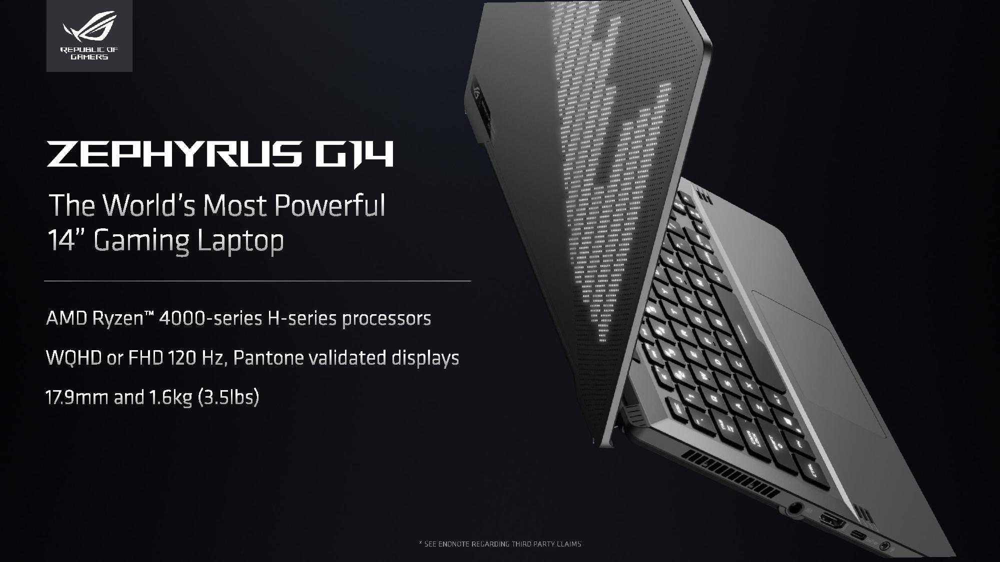 На своей презентации AMD представила «самый быстрый в мире» игровой ноутбук ASUS Zephyrus G14 с «эксклюзивным» процессором Ryzen 7 4800HS и графикой GeForce RTX 2060, это уместилось в 14-дюймовом корпусе весом около 1,6 кг.