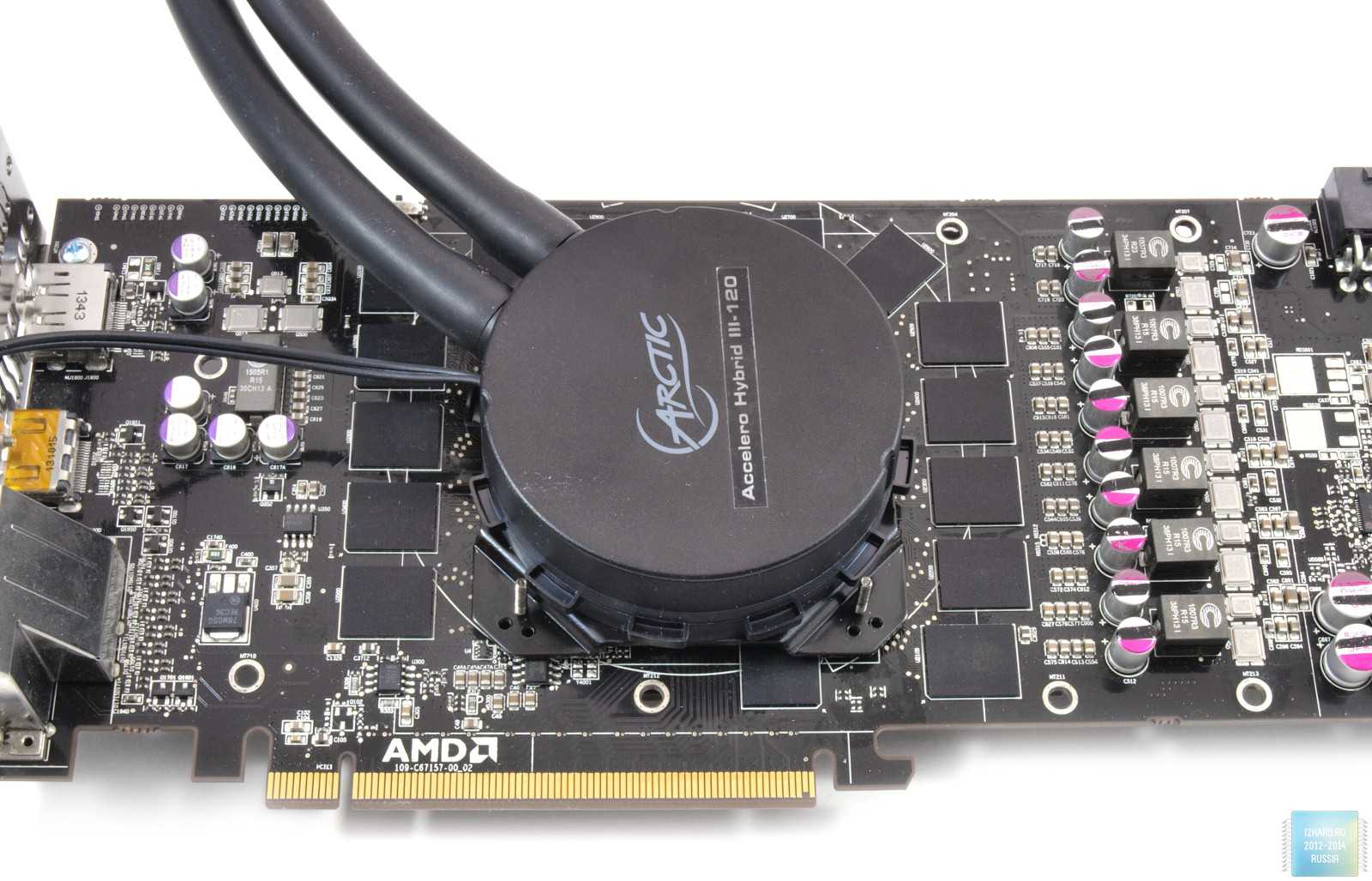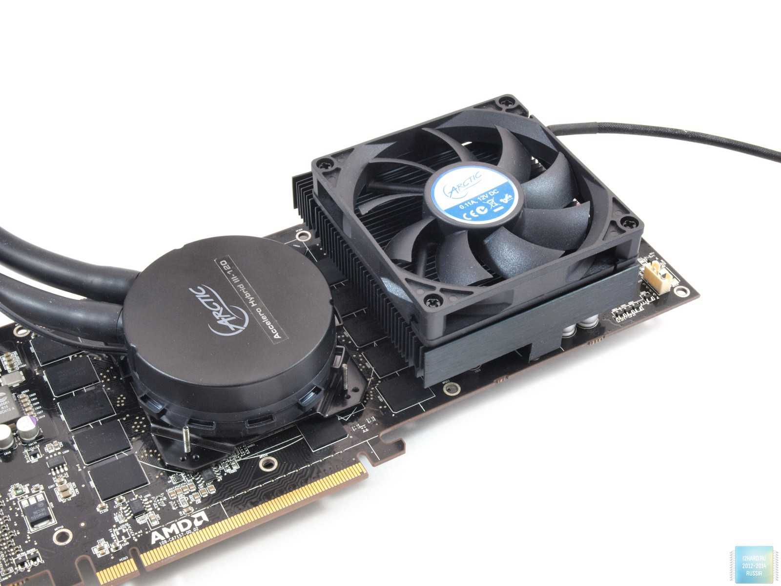 Поговорим о нюансах, о которых сами разработчики не заявляют. Во-первых, в семействе видеокарт Radeon подсистема питания разделена на две зоны – графического процессора (VRM1) и видеопамяти (VRM2). В комплекте системы охлаждения Arctic Accelero Hybrid III-120 отсутствуют радиаторы для силовой части памяти, хоть она подвержена меньшим нагрузкам, что первая, однако, забывать о ней не стоит. Можно прикрепить на термоскотч даже небольшой радиатор от микросхемы памяти, но здесь возникает второй нюанс – их в комплекте тоже нет. Для штатной работы видеокарты вполне можно обойтись и без них, но если вы собираетесь разгонять видеокарту, то советуем запастись ими отдельно.