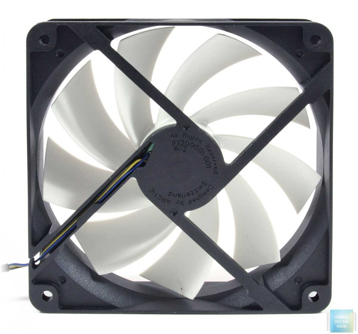 Модель Arctic Cooling F12 PWM получила свое широкое распространение благодаря хорошему соотношению стоимости, производительности и качества, а также тому факту, что разработчики оснащают ими все свои системы охлаждения. Тут волей-неволей будешь ими пользоваться. Вентилятор имеет черную рамку и белоснежную девятилопастную крыльчатку. Заявленная скорость вращения составляет 500-1350 об/мин, при тестировании удалось регулировать в диапазоне 490-1300 об/мин. Длина провода составляет шокирующие 550 мм, которых хватит для подключения в любой ситуации.