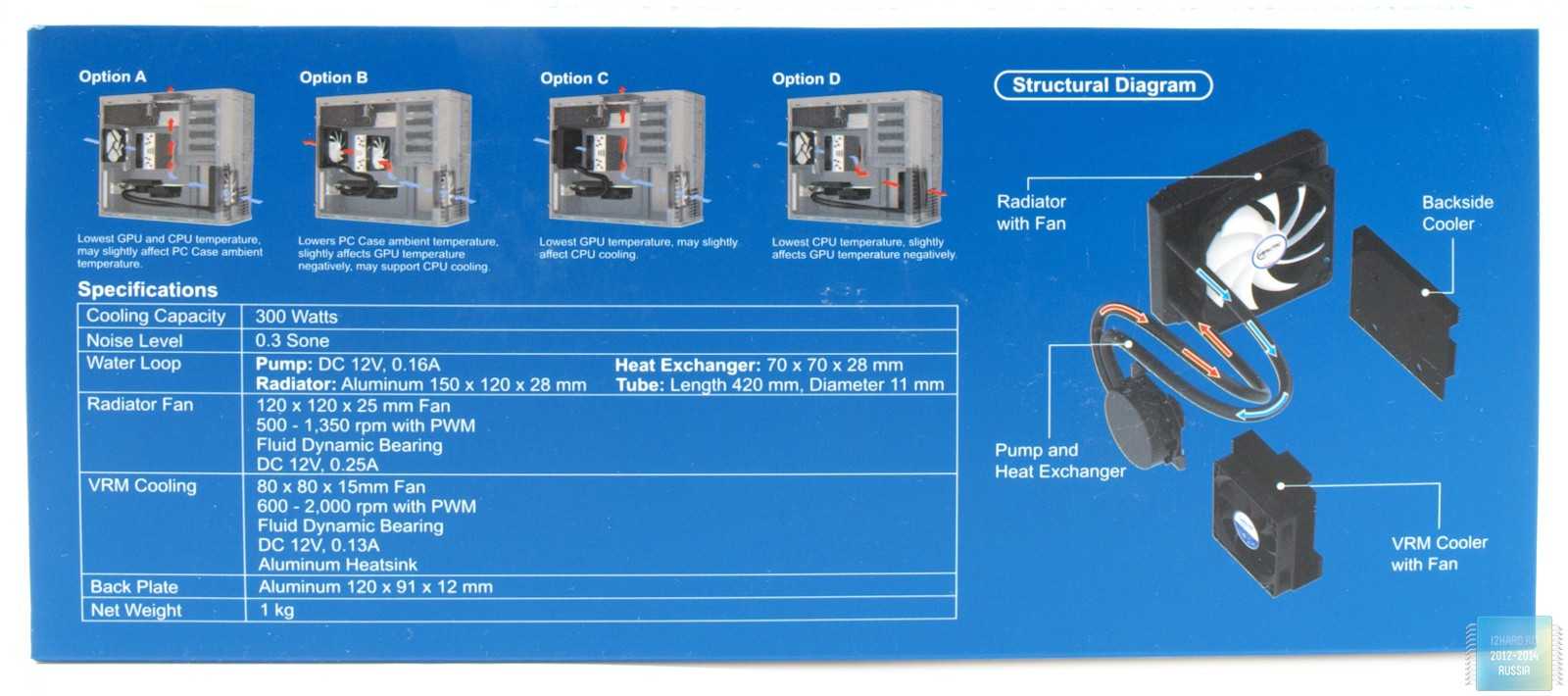 На торце упаковки приводится таблица с техническими характеристиками основных элементов СВО, в частности, размеры помпы и охладителя, скорость вращения вентиляторов и вольтамперные характеристики. Нашлось место и скромному описанию продукта, рассказывающему о предназначении кулера и его возможностях.