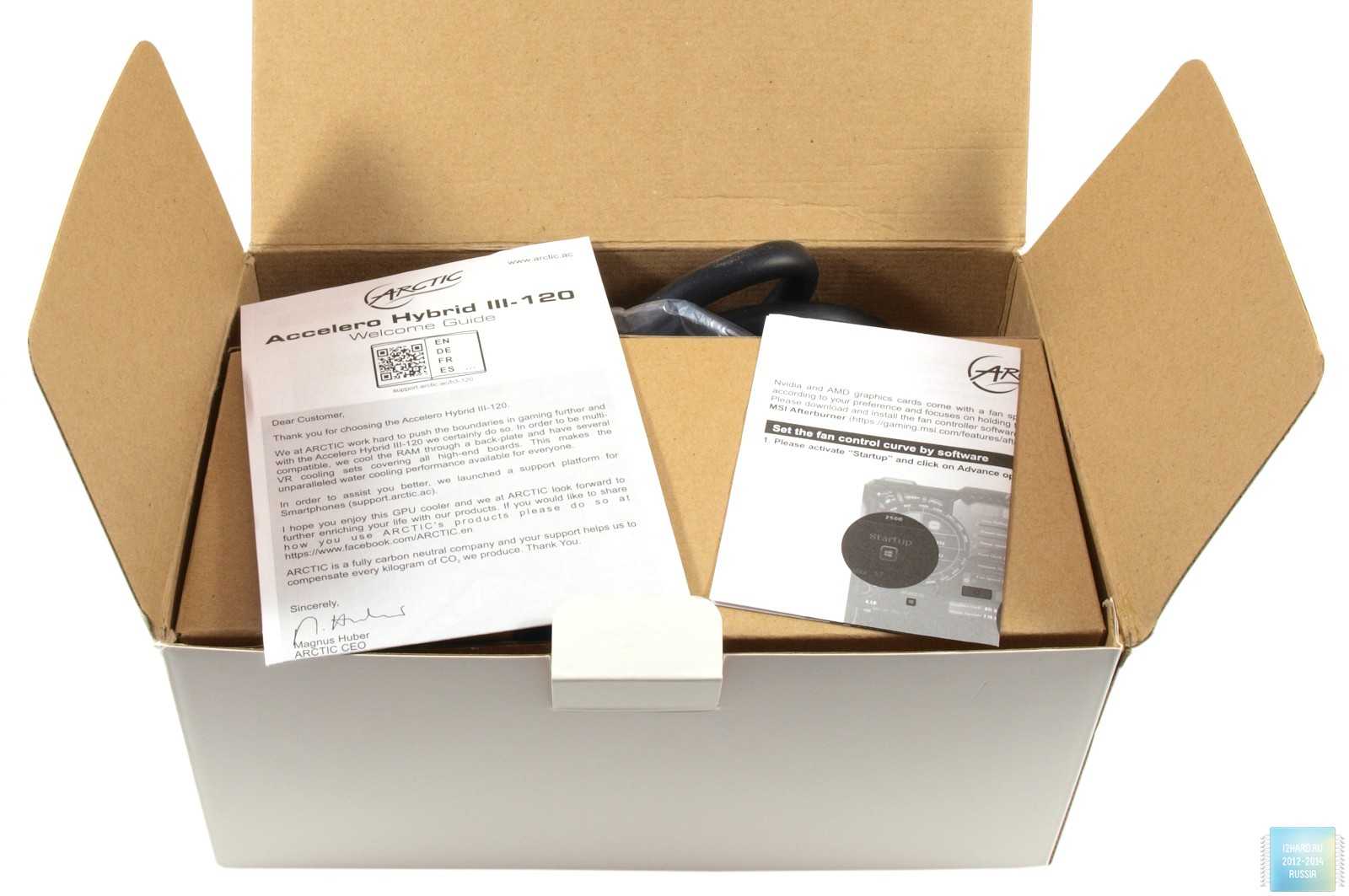 Комплект жидкостной системы охлаждения Arctic Accelero Hybrid III-120 поставляется в оригинальной упаковке скромных размеров, чуть больше коробки от игровой мыши.