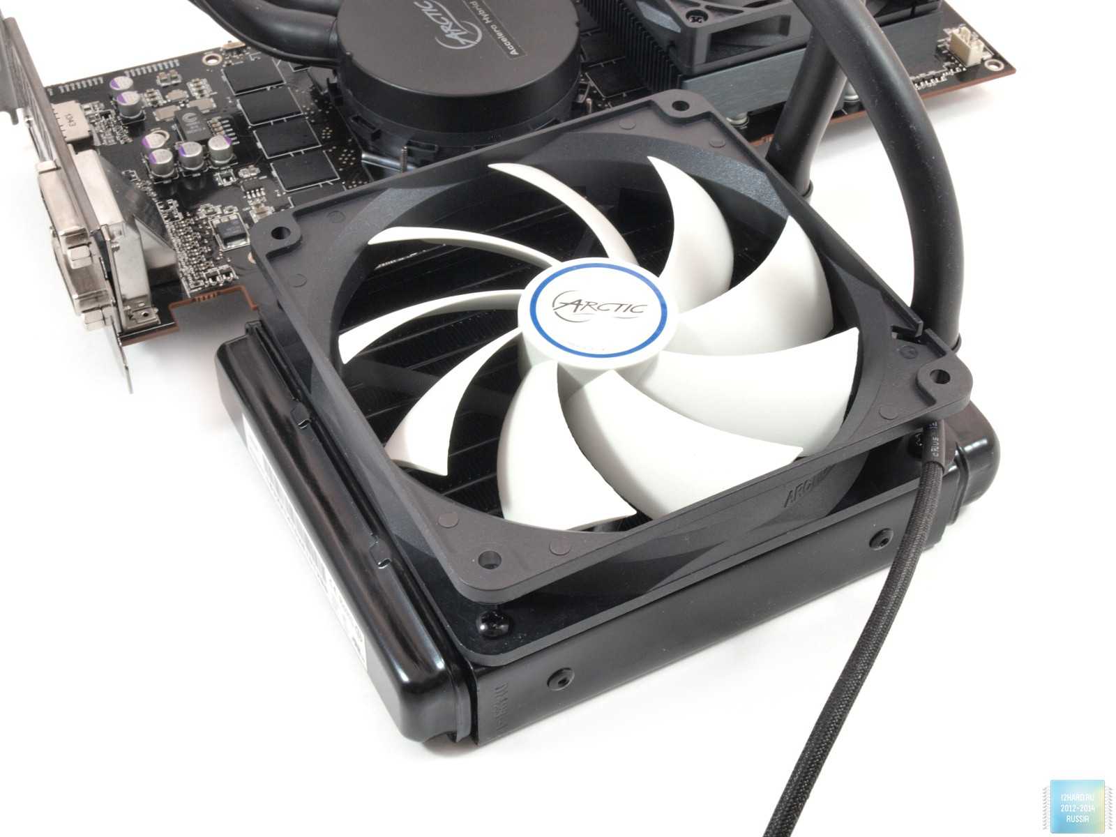 Поговорим и о комплектных вентиляторах. Вместе с Arctic Accelero Hybrid III-120 поставляются фирменная вертушка Arctic CoolingF12 PWM для установки на основной радиатор и низкопрофильный 80 мм – для радиатора зоны VRM.
