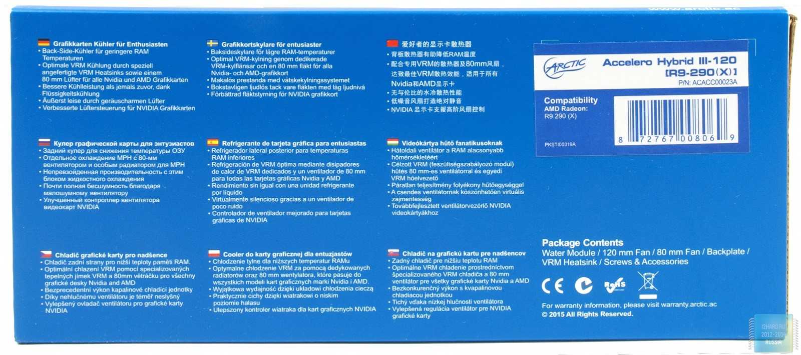 Полиграфия сведена к белоснежным тонам, чтобы дать владельцу возможность сосредоточится на информационной части, которой отведена важная составляющая. Разработчики помимо наименования продукта отметили изображение новинки в установленном на видеокарте виде. Дополнительно приводится описание комплектации, включающая вентилятор Arctic F12 PWM для установки на радиатор, бэкплейт, радиатор подсистемы питания и смежный вентилятор 80 мм.