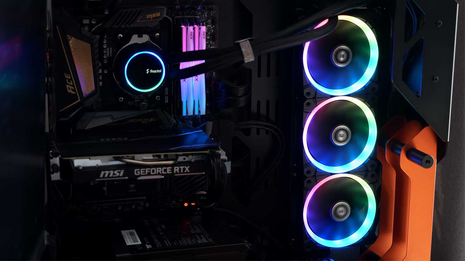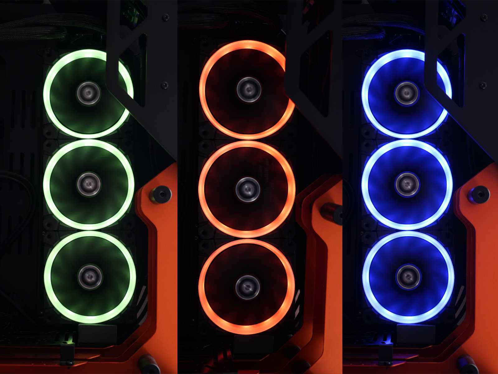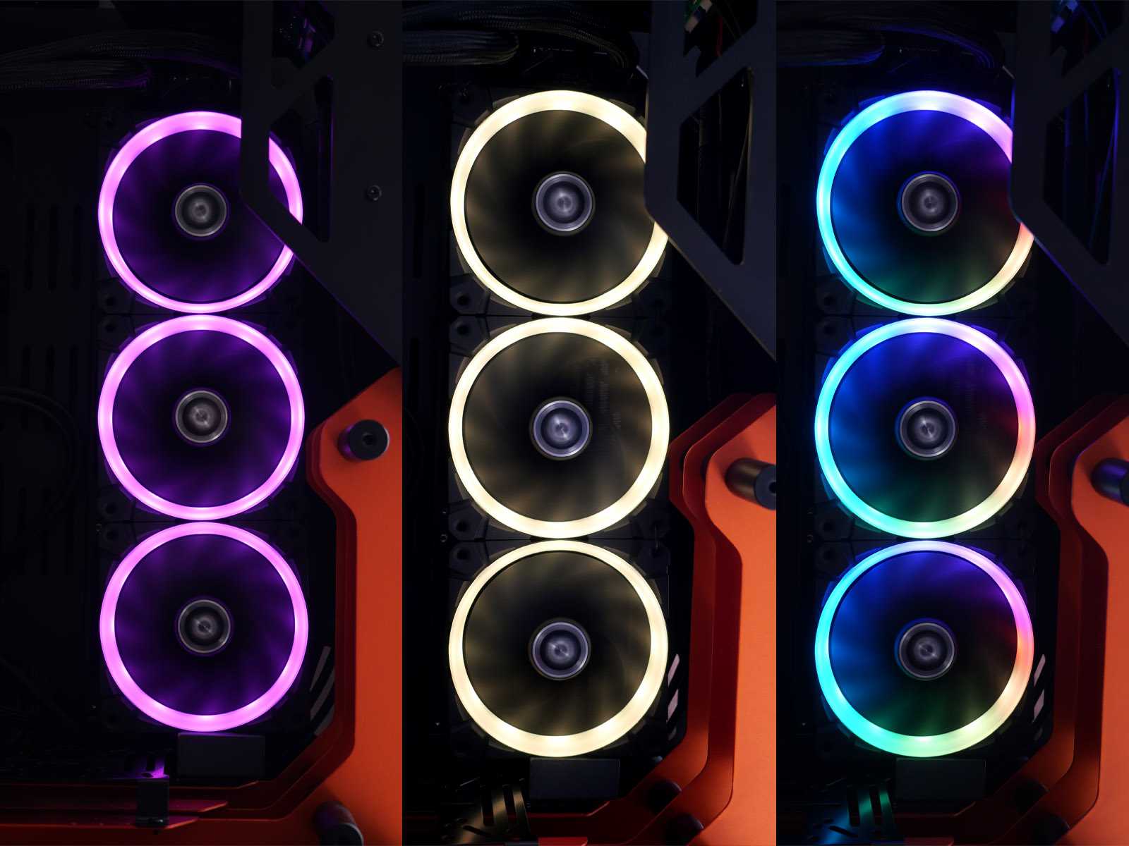 Кольцевая подсветка каждого вентилятора базируется на двенадцати адресуемых светодиодах. Это позволяет создать равномерное красивое свечение вокруг крыльчатки. Лопасти не подсвечиваются, но мягкие отсветы находят своё отражение на их гранях.