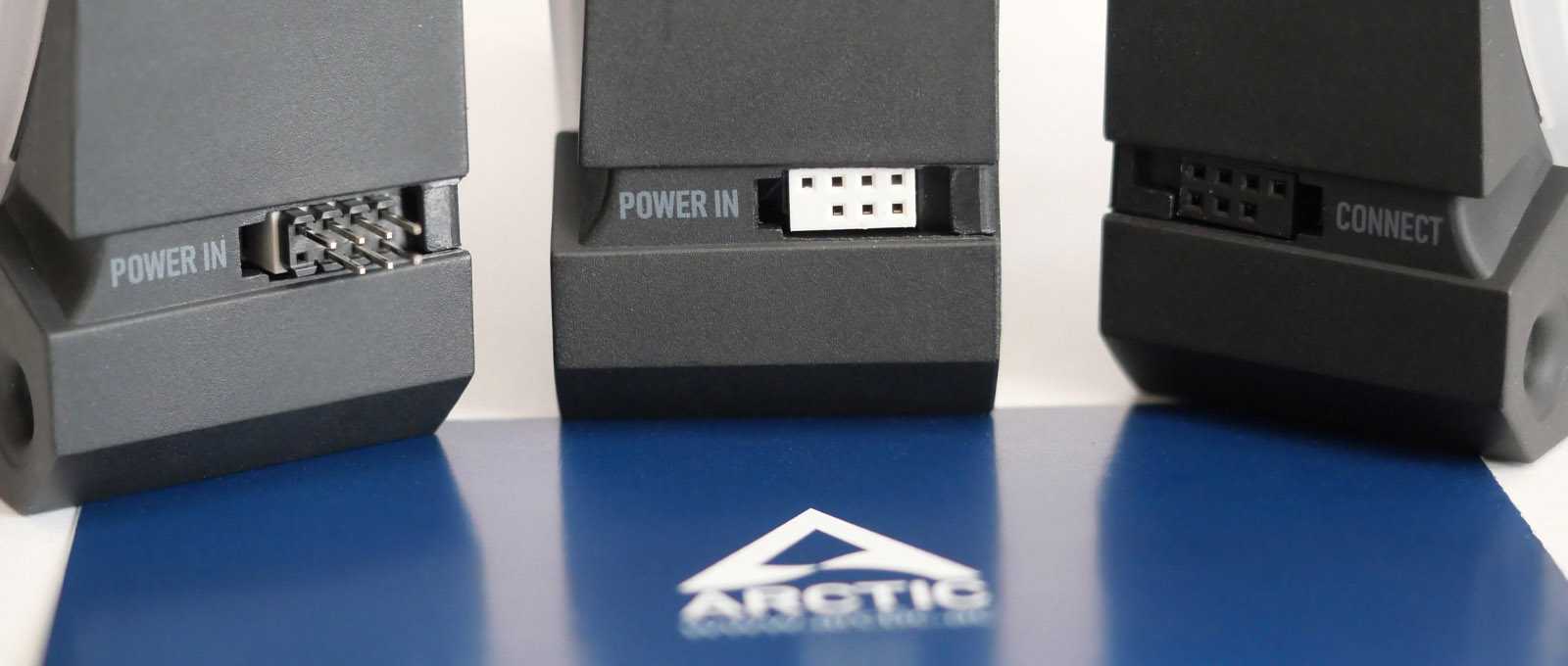 Особенностью ARCTIC BioniX P120 является модульное подключение кабелей, через которые питается мотор вентилятора и модуль кольцевой ARGB-подсветки. Решение очень элегантное и направлено на беспроводное подключение группы вентиляторов между собой по цепочке. Для этого на корпусе каждого вентилятора с противоположных боковых граней сделаны компактные гнездовые семиконтактные разъёмы POWER IN (ввод питания) и CONNECT (вывод на следующий вентилятор). В цепочку можно включать до пяти вентиляторов.