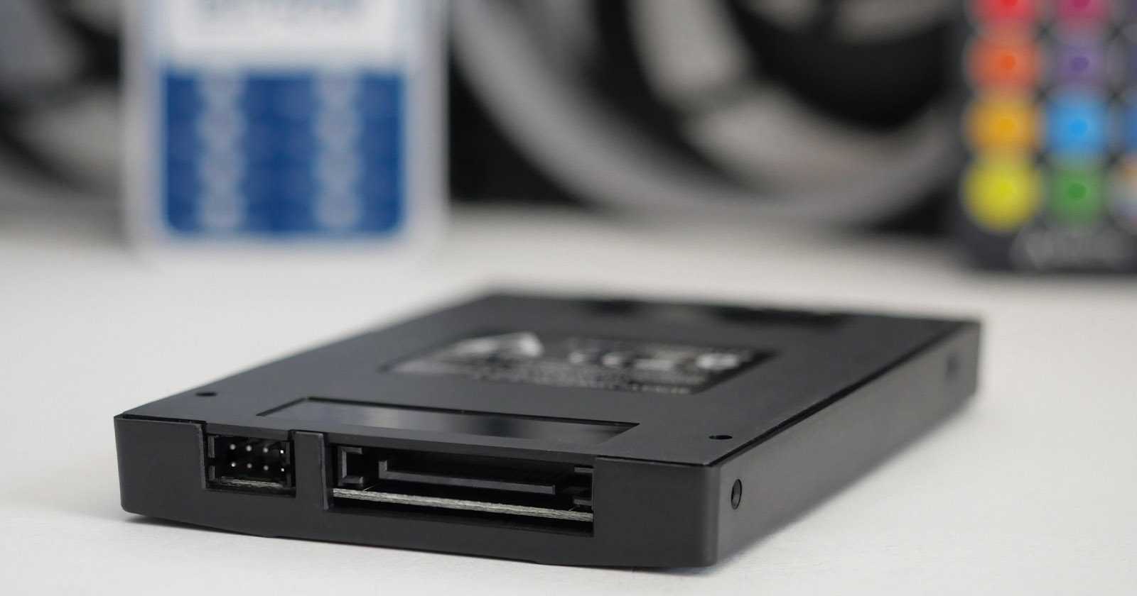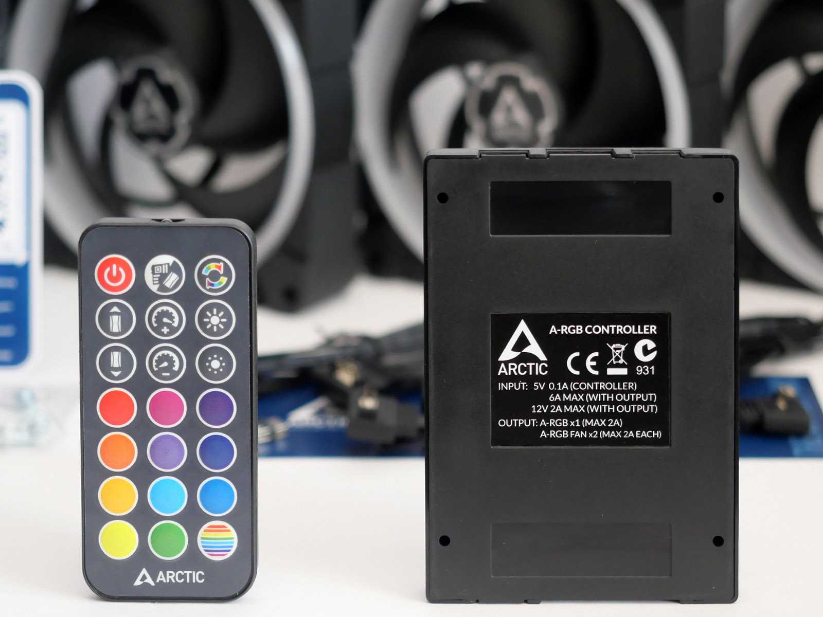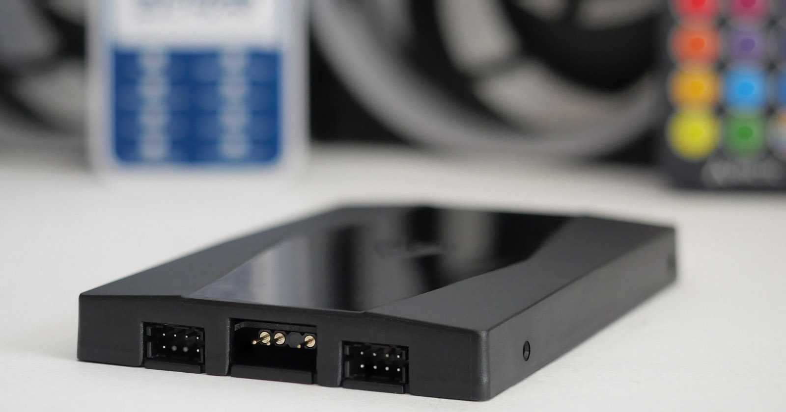 Комплектные кабели позволяют включить вентиляторы в соответствующие управляющие трёхконтактные ARGB-разъёмы (типа ASUS AURA) с питанием +5 В на материнской плате. При отсутствии таковых пригодится контроллер эффектов размером и креплениями как у 2,5»-накопителей. Весьма удобное решение, позволяющее его аккуратно установить в корзине для накопителей. Контроллер работает как автономно с управлением беспроводным пультом, так и с синхронизацией через «простой» четырёхконтактный RGB-разъём с питанием +12 В на материнской плате. Питание самого контроллера осуществляется от SATA-коннектора.
