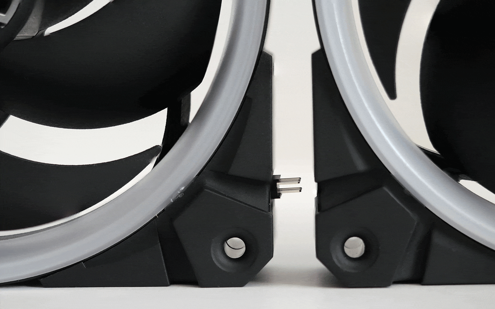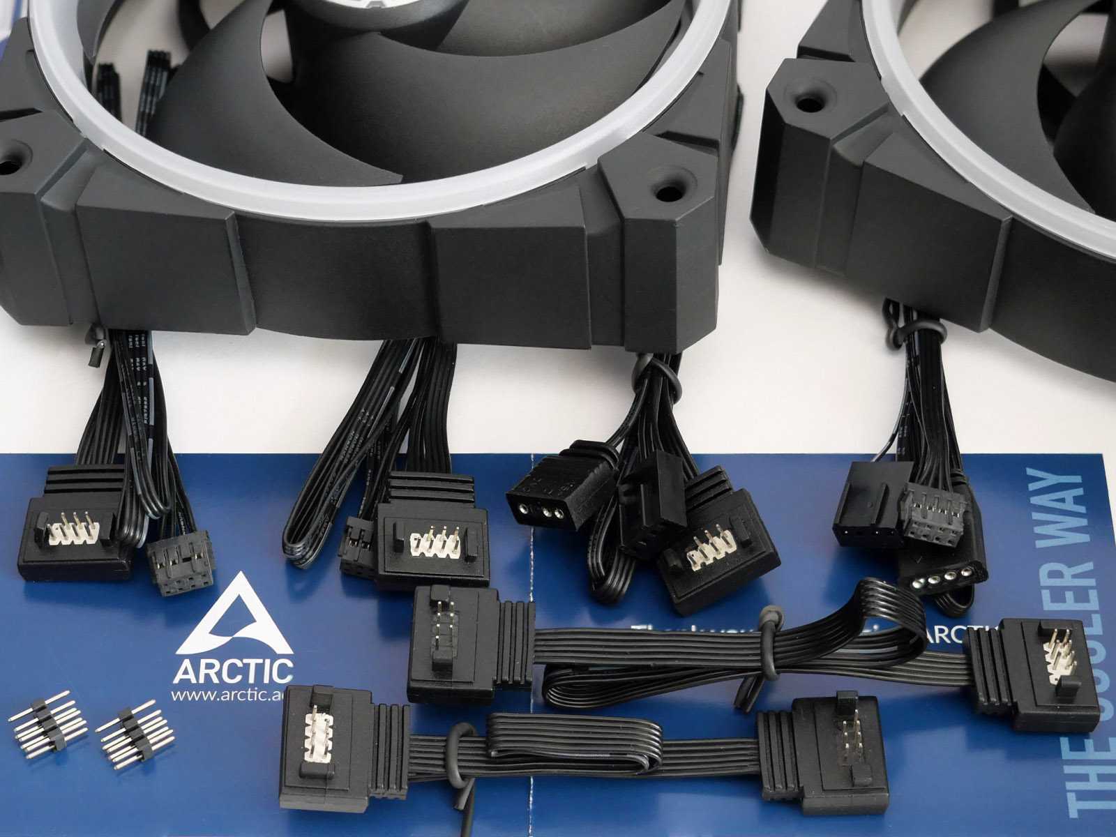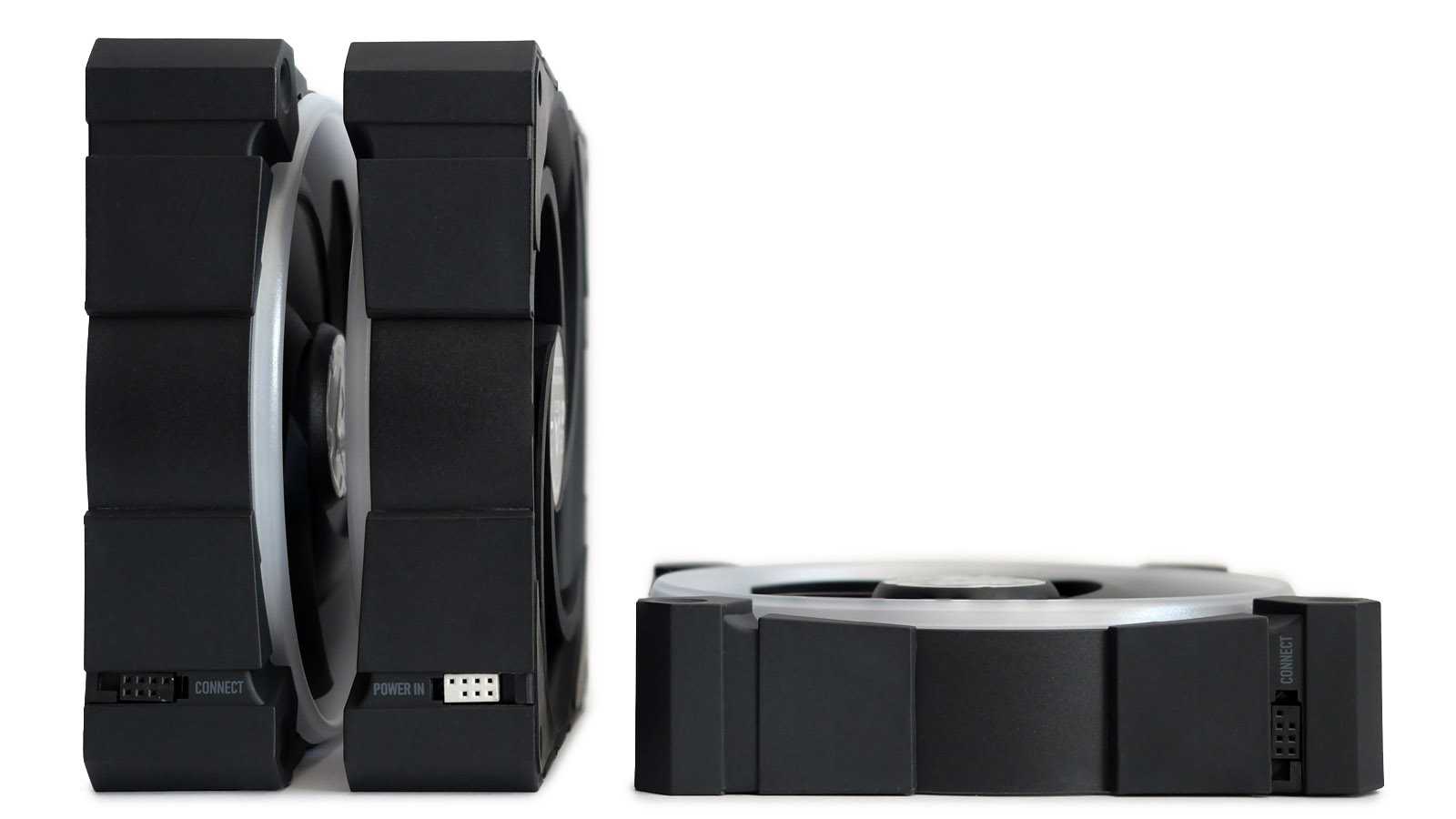 При использовании проводных соединений плотное размещение вентиляторов коннекторами друг к другу уже не получится из-за их толщины. Однако особого неудобства данный факт не добавит, ведь симметричные каркасы вентиляторов можно развернуть в корпусе или на радиаторе СЖО таким образом, чтобы коннекторы оказались по неупирающимся друг в друга граням.
