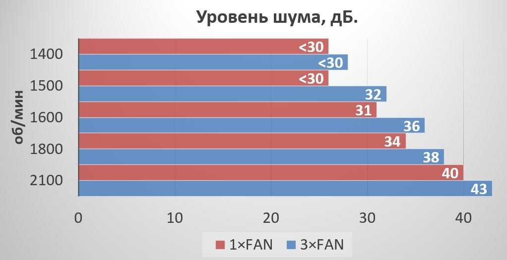 При оборотах ниже 1500 уровень шума снижается менее 30 дБ, что является вполне комфортным показателем. В закрытом корпусе вентиляторы можно назвать бесшумными. Значительный уровень шума, более 40 дБ, только на максимальных оборотах, но это приемлемо для производительных вентиляторов, работающих на 2000 об/мин.