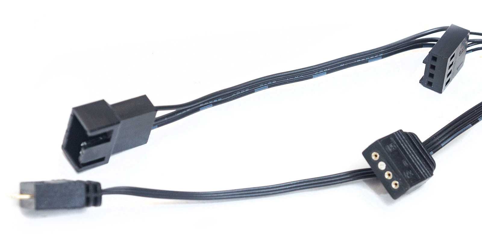 Длина каждого кабеля — 40 см. Также добавлены штекеры-разветвители, позволяющие подключить последовательно вентиляторы между собой. Это тоже особенность данной модели, чаще производители просто добавляют в комплект хаб на несколько устройств.