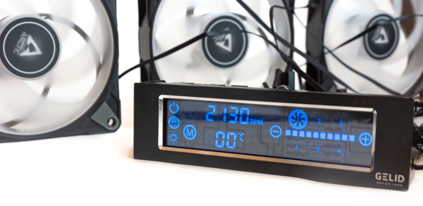 В первом тесте мы определим шумовые характеристики комплекта. Для этого подключим вентиляторы к панели GELID Solutions SpeedTouch 6, она дает возможность ступенчато регулировать напряжение, подаваемое на вентиляторы — от 6.5 до 12 В, также демонстрирует скорость вращения вентиляторов.