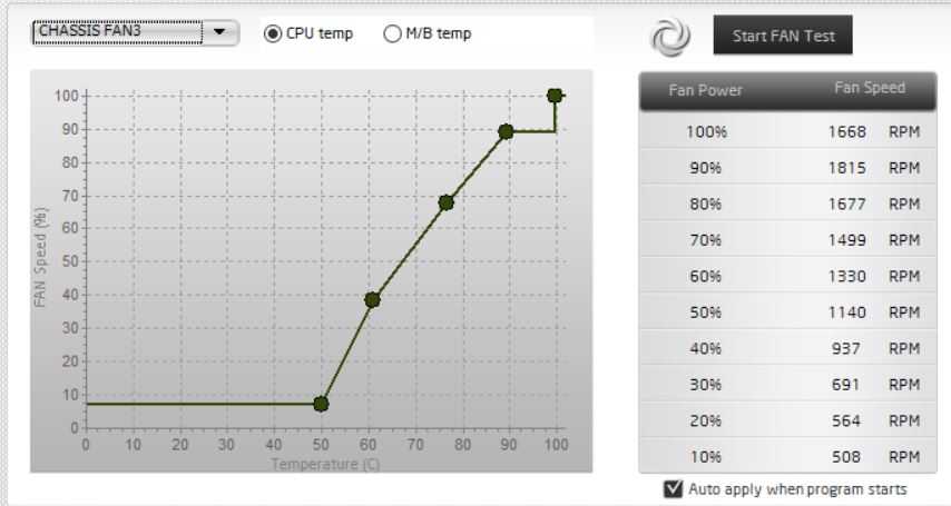 Но при этом вентилятор все равно стартует достаточно часто, при старте в течении секунды слышен стрекот двигателя. Все же 10% для нулевого уровня — очень низкий порог, более эффективно смотрелись бы 20 или 30% — это остановка при 600 об/мин.