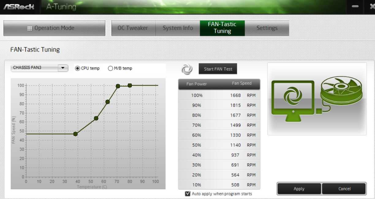 Во втором тесте мы посмотрим алгоритм работы ШИМ-управления. Для этого вентиляторы были подключены к материнской плате ASRock X570 Extreme 4 к разъему FAN3. Управление через утилиту A-Tuning. Данная утилита в автоматическом режиме определяет возможности вентилятора по регулировке оборотов в зависимости от ШИМ-заполнения и выводит данные в виде таблицы.