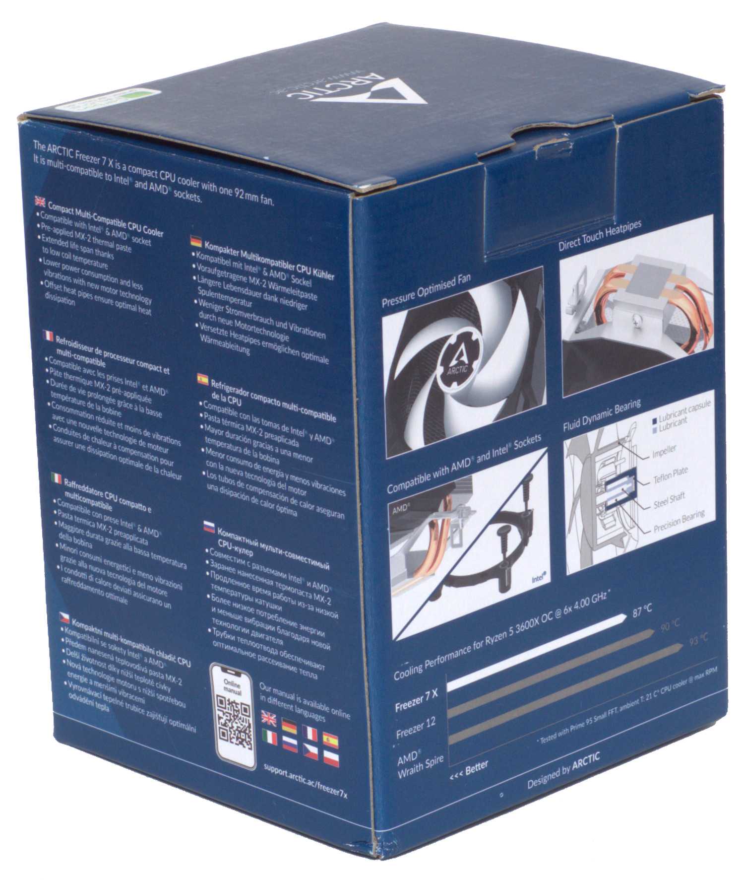 Обычно для бюджетных кулеров производители делают оформление коробки красочным и весьма информативным, привлекая внимание к своему продукту. Подобное можно сказать и о коробке кулера Arctic Freezer 7X, дизайн которой выполнен в строгом фирменном стиле и содержит максимальный объем информации, начиная с внешнего вида, характеристик и заканчивая подробным описанием конструкции, в том числе приводя многоязычное описание