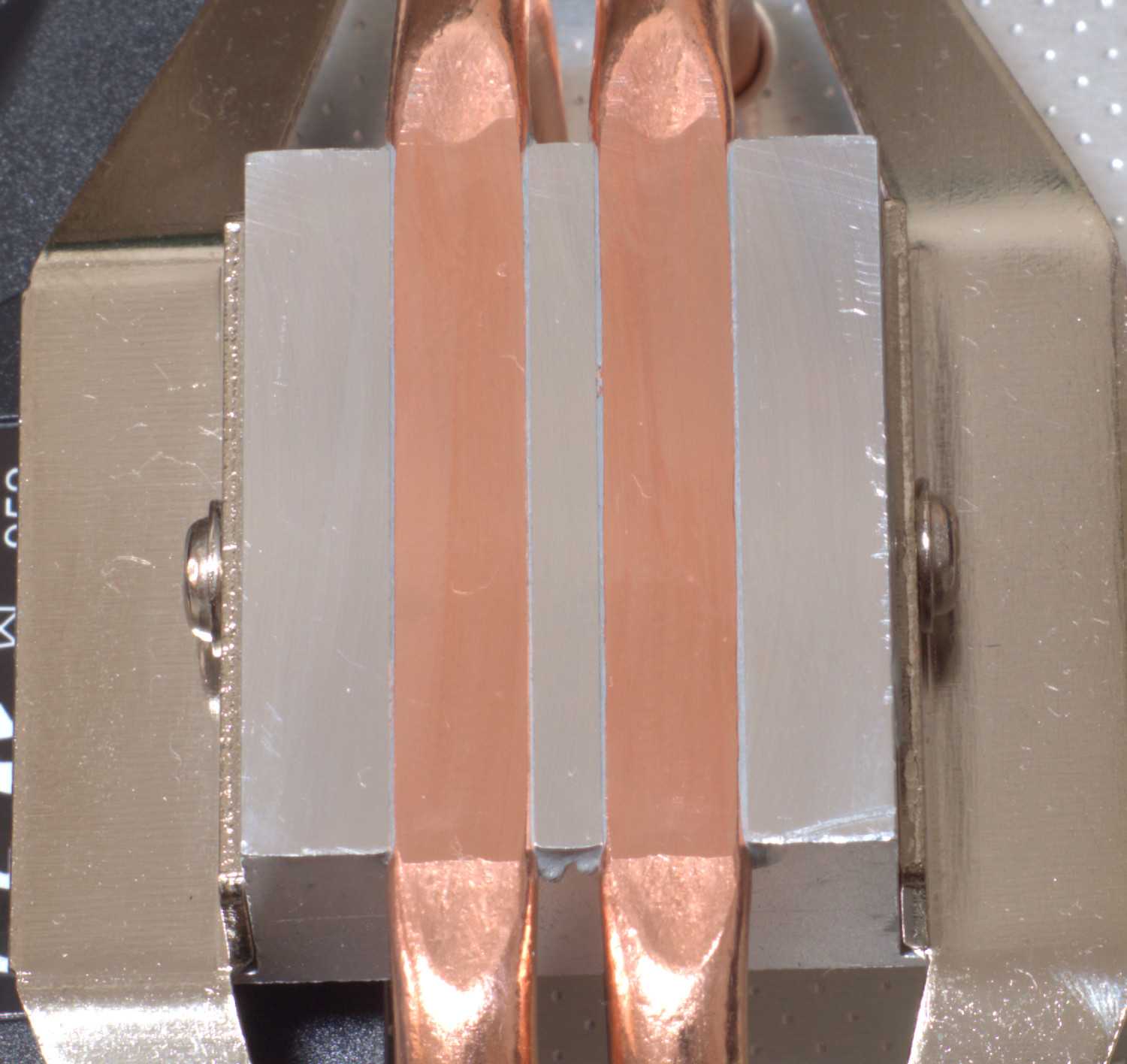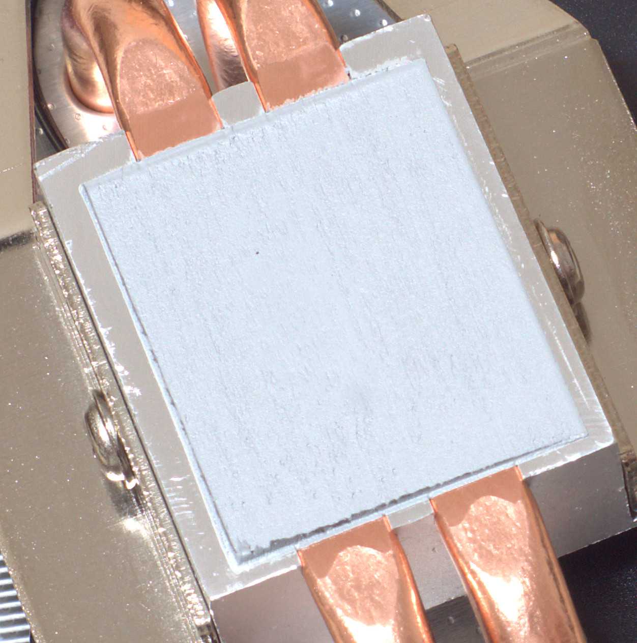 Если снять кулер, то можно увидеть пятно контакта термопасты и то, как давление распределяется по поверхности теплосъёмника, которым выступают плоские тепловые трубки.