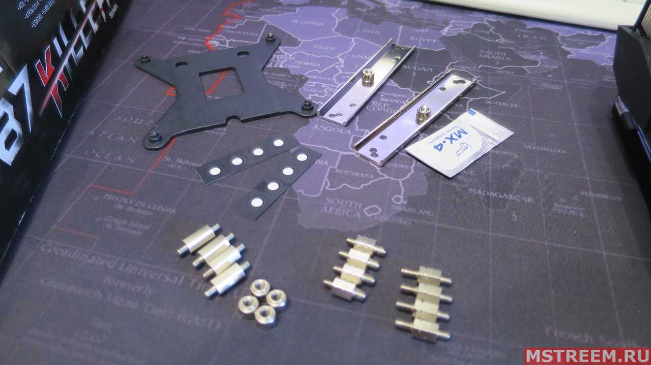 Далее устанавливается металлический бэкплейт, после чего вторая пара шайб наклеивается на лицевую часть установочных отверстий, на материнской плате.