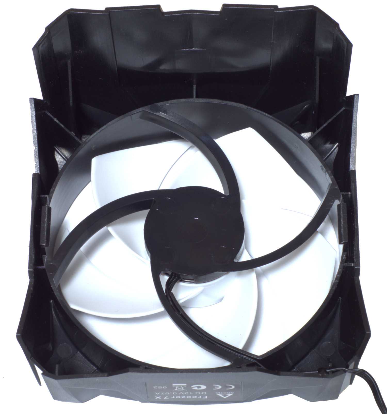 В комплект также входит 92 мм вентилятор без маркировки (Arctic Freezer 7X), для которого производитель указал максимальные обороты 2000 rpm, использование гидродинамического подшипника и уровень шума 0.3 сона (~22.5 дБ). Особенность – вентилятор выполнен в виде кожуха, поэтому заменить его будет проблематично.