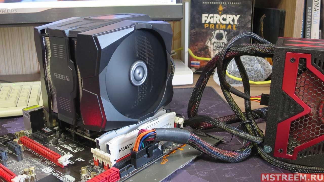 Никакого компьютерного корпуса не использовалось, чтобы корпус не оказывал своего влияние на частоту эксперимента и охлаждением процессора занимались только воздушные потоки от вентиляторов самого кулера.