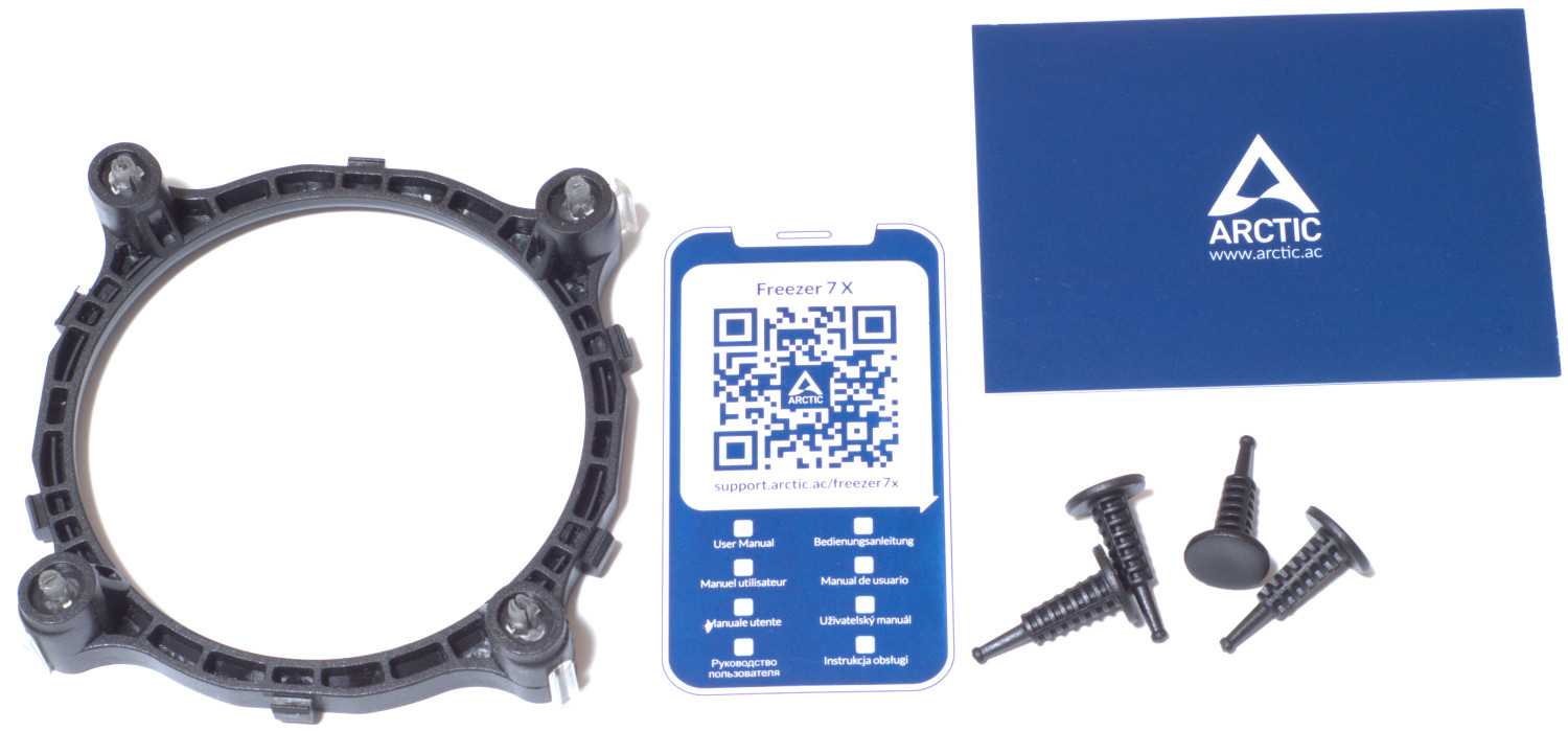 Комплектация у кулера простая. В коробке можно найти крепление для платформ Intel LGA775/115x/1200, листочек с QR-кодом на руководство пользователя и благодарность от компании.