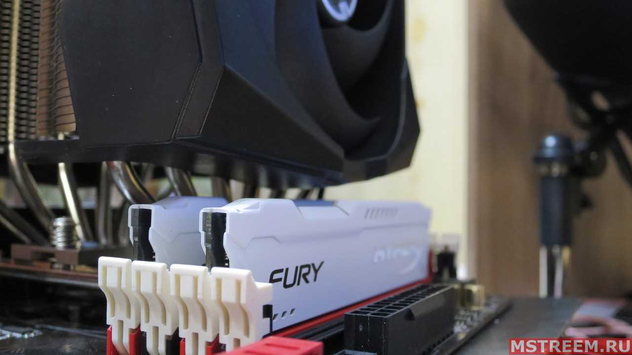 При установке оперативной памяти высотой в 32.8 мм (плашки HyperX Fury), ещё остаётся 5-6 мм свободного пространства в самой низкой части вентилятора.
