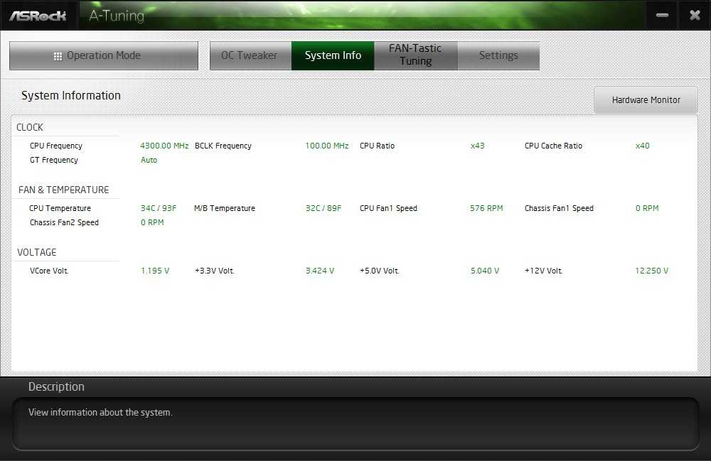 На закладке System Info собраны сведения о текущих параметрах системы – питающие напряжения, температуры, частоты и скорости вращения вентиляторов. Для точного мониторинга лучше использовать сторонние приложения (например, HWINFO64), так как в A-Tuning достаточно низкая частота опроса датчиков (1–2 с).