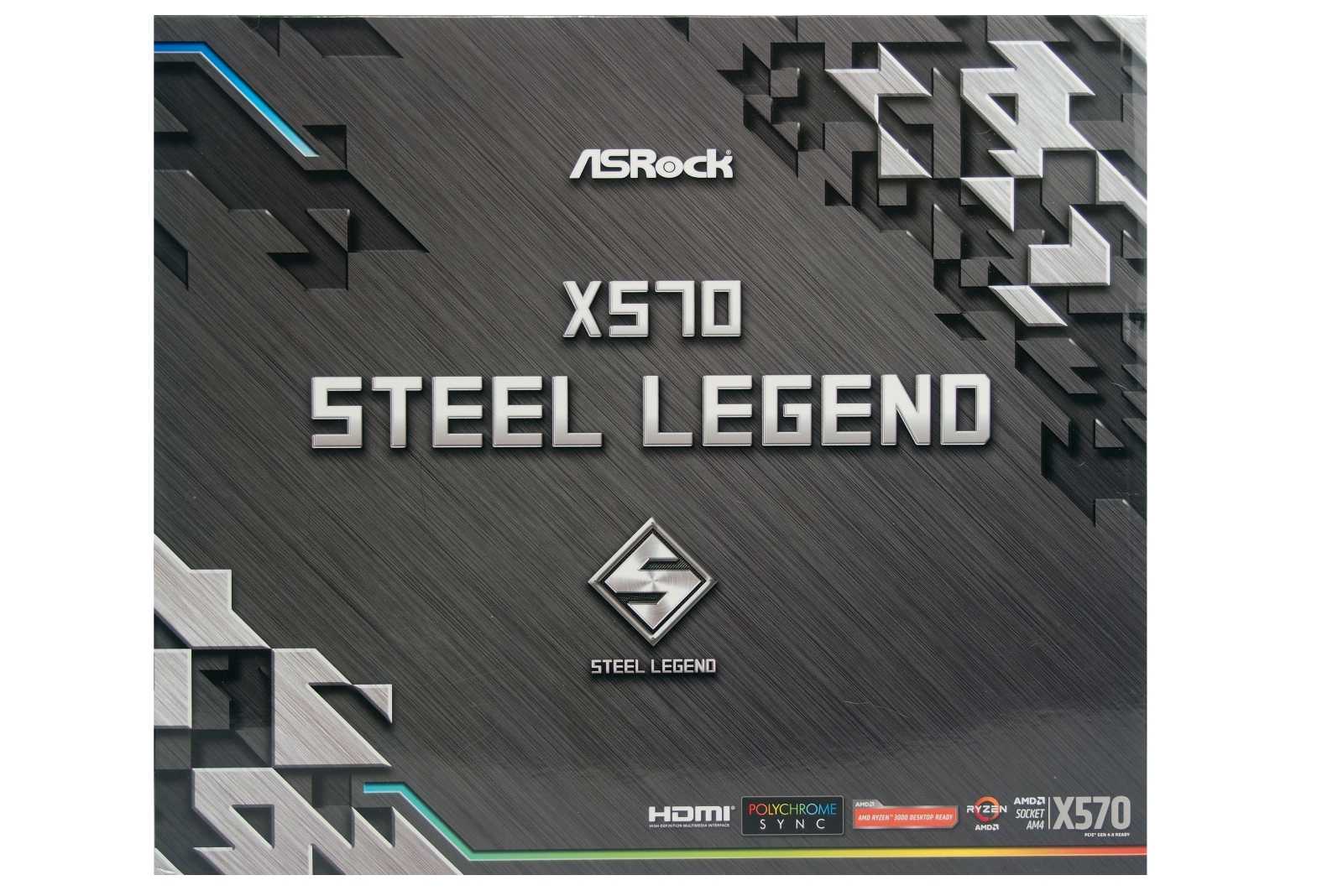 Фирменный стиль коробки X570 Steel Legend характеризует эту материнскую плату, как сильный продукт. В числе отмеченных производителем особенностей для X570 Steel Legend значится экосистема RGB-подсветки Polychrome Sync, готовность принять на борт процессоры Ryzen 2000-й и 3000-й серии, наличие чипсета AMD X570.