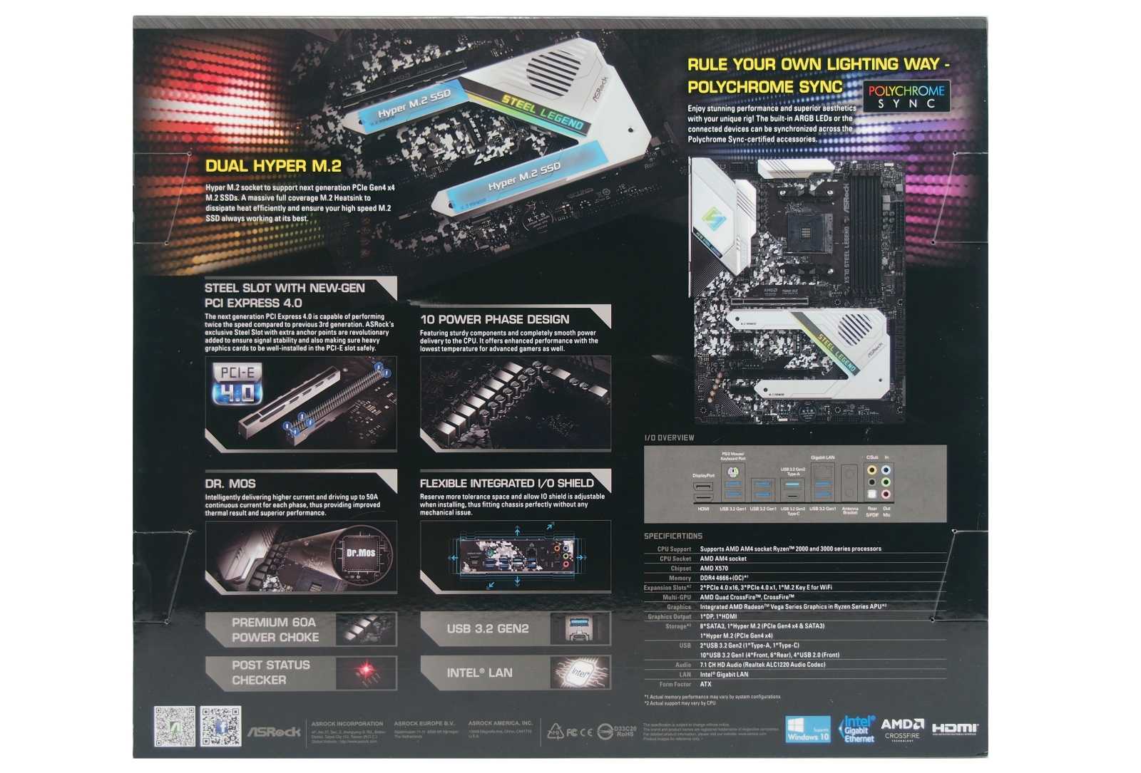 Более подробно о X570 Steel Legend производитель рассказывает на тыльной стороне упаковки. Главный акцент сделан на конструкционных особенностях материнской платы, использованных при ее производстве компонентах, системе питания процессора и охлаждении накопителей М.2. Отдельными блоками размещена информация о разъемах тыльной панели и технических характеристиках X570 Steel Legend.