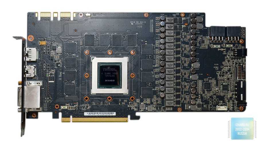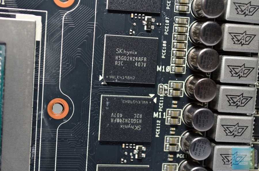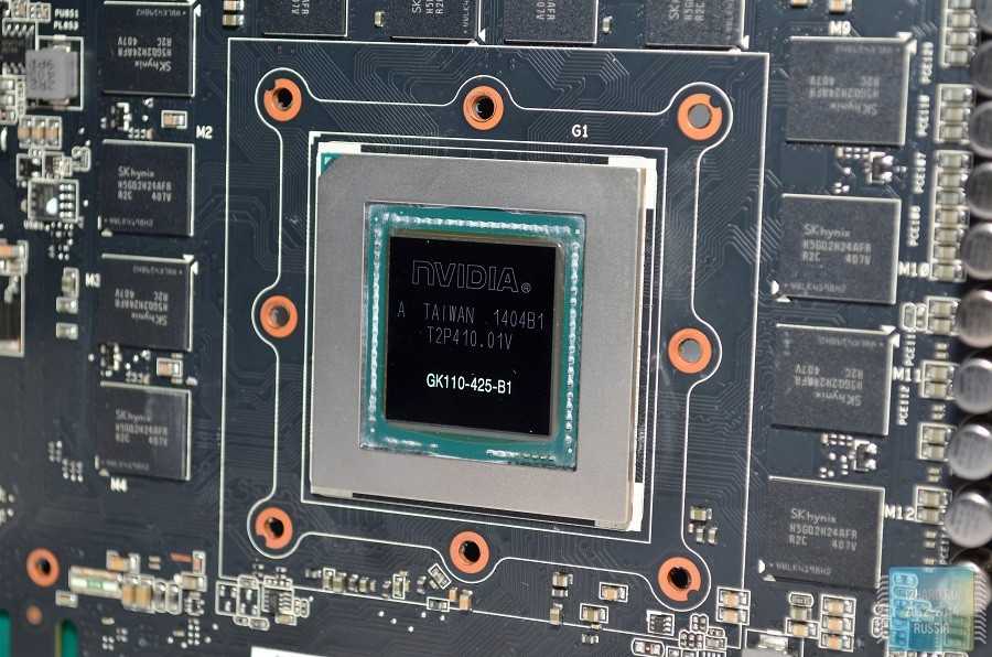 В центре расположен графический чип GK110 выпущенный на 4-ой неделе 2014 года, а вокруг распаяны чипы памяти SKhynix с маркировкой H5GQ2H24AFR.