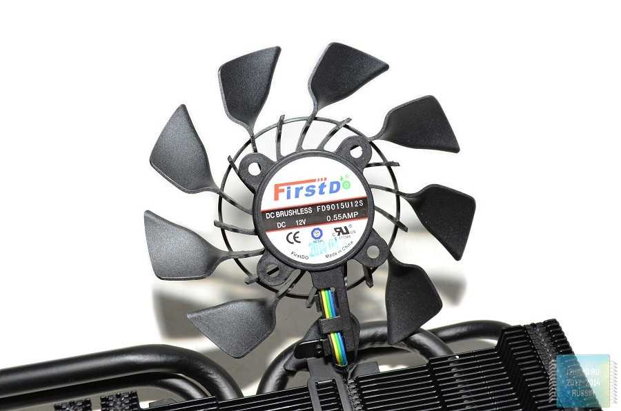 Второй вентилятор имеет уже более стандартный вид. Это объясняется тем, что помимо основного радиатора, он дополнительно охлаждает элементы подсистемы питания графического адаптера. А значит нужно, чтобы большая часть воздушного потока направлялась именно перпендикулярно текстолиту платы.
