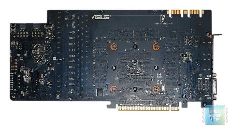 Поскольку все значимые элементы и узлы расположены на лицевой стороне, то обратная часть печатной платы практически ничем не примечательна, хотя и тут есть свои особенности. Главным образом они коснулись возможностей разгона видеокарты ASUS GeForce GTX 780 DirectCU II ОС и в первую очередь будут интересны оверклокерам.