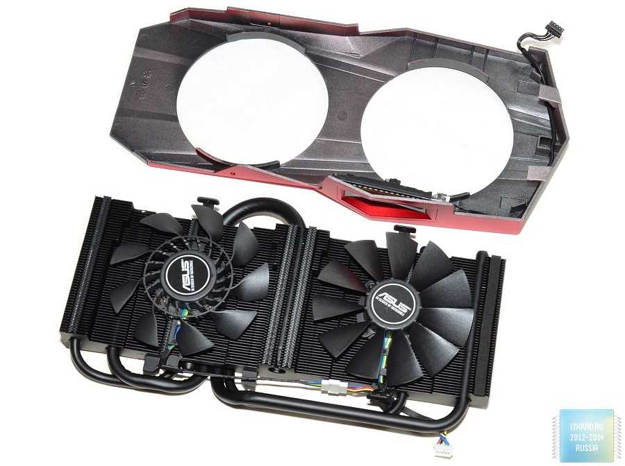Как уже было сказано выше, система охлаждения на ASUS GeForce GTX 780 DirectCU II ОС существенно отличается от эталонного варианта. Вместо «референсной» турбины и испарительной камеры здесь установлен большой радиатор с тепловыми трубками, который продувается двумя вентиляторами.