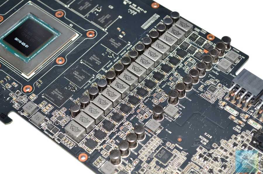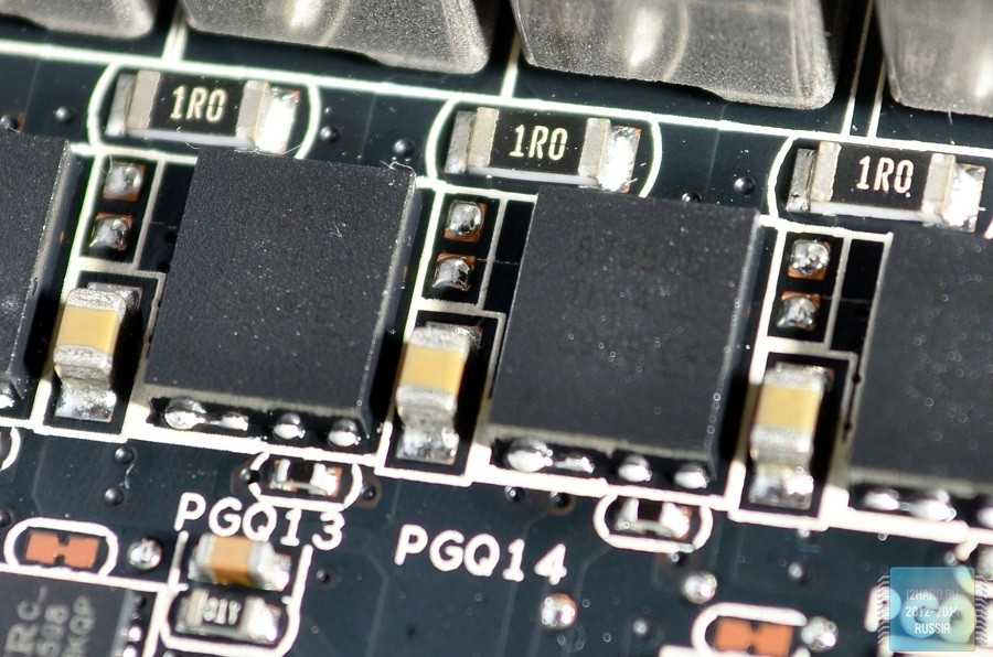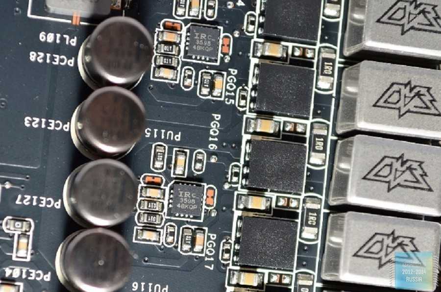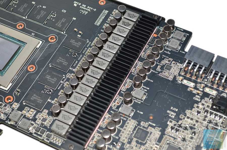 В соответствии с фирменной концепцией Super Alloy Power, при производстве рассматриваемого видеоускорителя была применена только качественная элементная база: твердотельные и танталовые конденсаторы, а также дроссели с ферритовыми сердечниками. Силовая часть каждой фазы состоит из трех «мосфетов»: двух NTMFS4937N и одного NTMFS4955N.