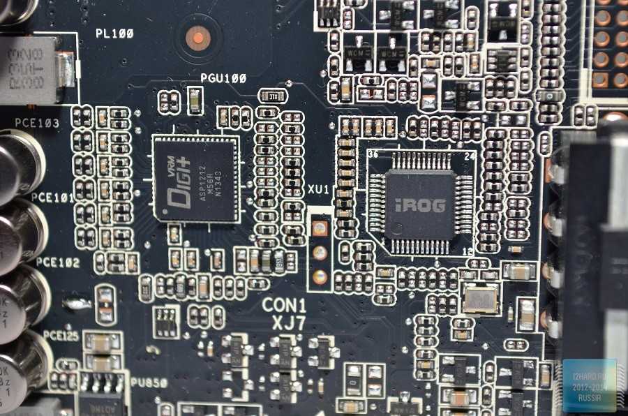 Управляет подсистемой питания ШИМ-контроллер промаркированный как Digi+ VRM ASP1212. Правее расположен чип промаркированный iROG, он управляет подсветкой светодиодов на боковой панели.