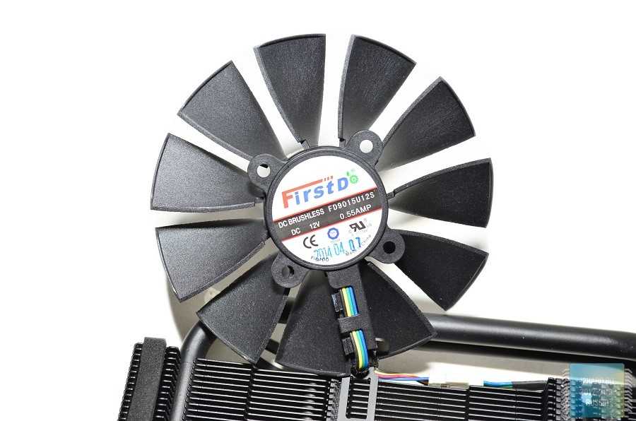 Активная часть системы охлаждения представлена двумя вентиляторами с диаметром крыльчатки 97 и 95 мм. Конструктивно они немного отличаются между собой. Первый из них совмещает в себе черты классического вентилятора и турбины. Хорошо заметно, как меняется угол «атаки» лопастей — чем ближе к центру вентилятора, тем он больше. Таким образом, обеспечивается разнонаправленность воздушного потока, за счет чего улучшается отвод тепла от пластин, в чем мы уже успели убедиться в обзоре видеокарты ASUS GeForce GTX 670 DirectCU Mini OC.