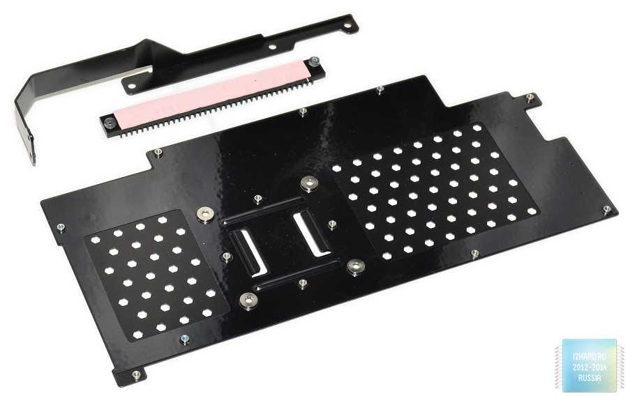 Еще одним элементом системы охлаждения является перфорированная для отвода тепла металлическая пластина. Вместе со вспомогательной планкой, данная пластина задает ребро жесткости и плата не прогибается при установке в корпус.