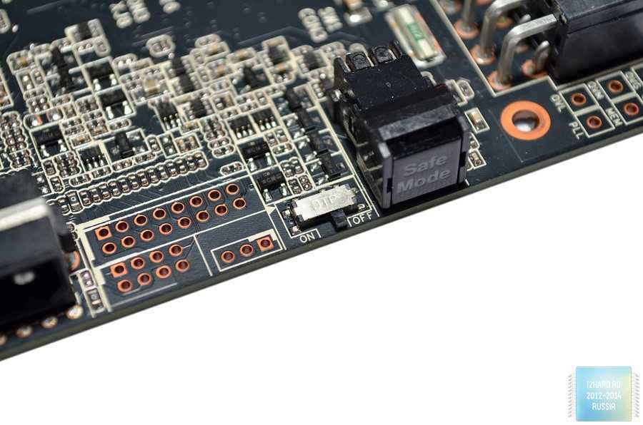 На краю платы расположена кнопка Safe Mode, для возврата заводских настроек БИОСа. Левее расположен переключатель для активации подогрева памяти.