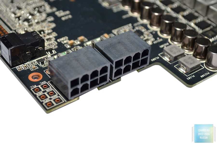 Также хотим обратить внимание на удобное расположение разъемов для дополнительного питания. В текстолите сделаны специальные прорези, что упрощает процесс подключения/отключения коннекторов PCI-E