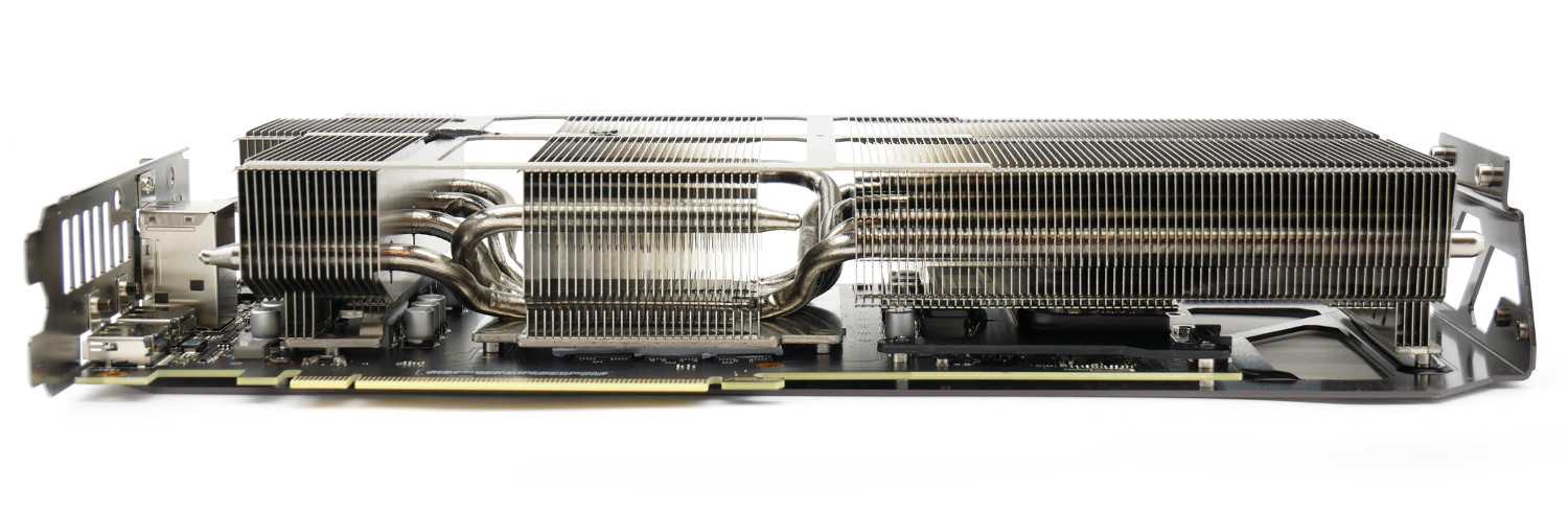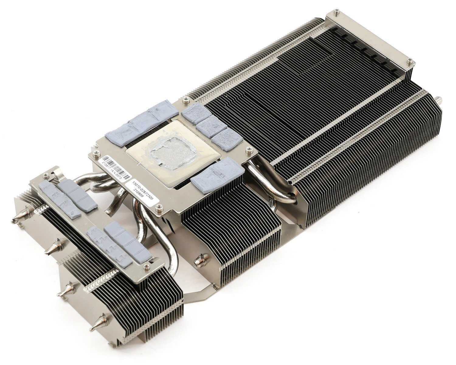 Сама СО очень развитая. Крупный радиатор пронизан большим количеством тепловых трубок. Кристалла графического процессора касается специальная теплораспределительная плита. Такое решение чаще встречается именно на видеокартах самого высокого класса. В более бюджетных вариантах обычно задействуется решение с прямым контактом тепловых трубок.
